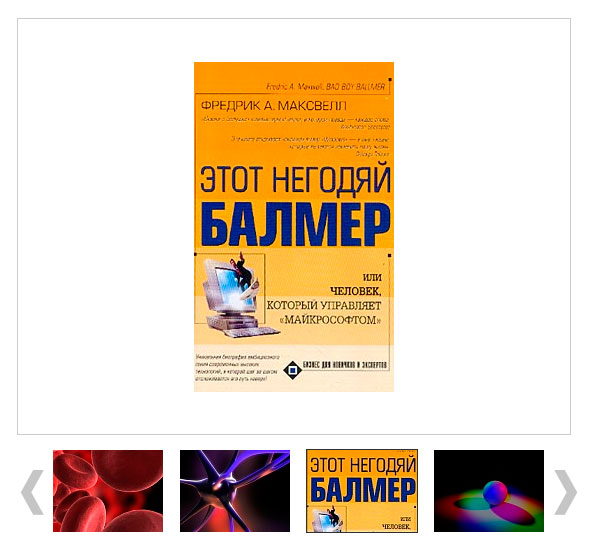 Выводится одна большая картинка и несколько миниатюр снизу. При клике на миниатюру, соответствующая ей картинка заменяет изображение большой картинки. При клике по большой картинке, выводится оригинал изображения.