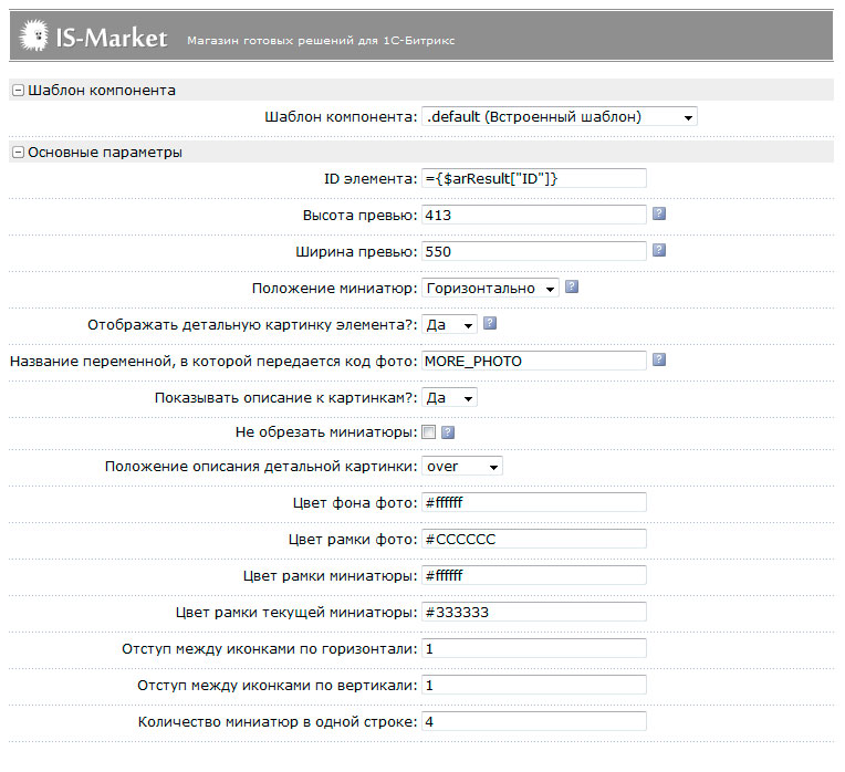 Компонент имеет массу настроек. Можно задавать ширину блока изображений, размеры большой картинки, количество миниатюр в строке и множество других параметров.