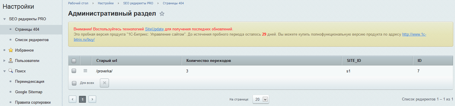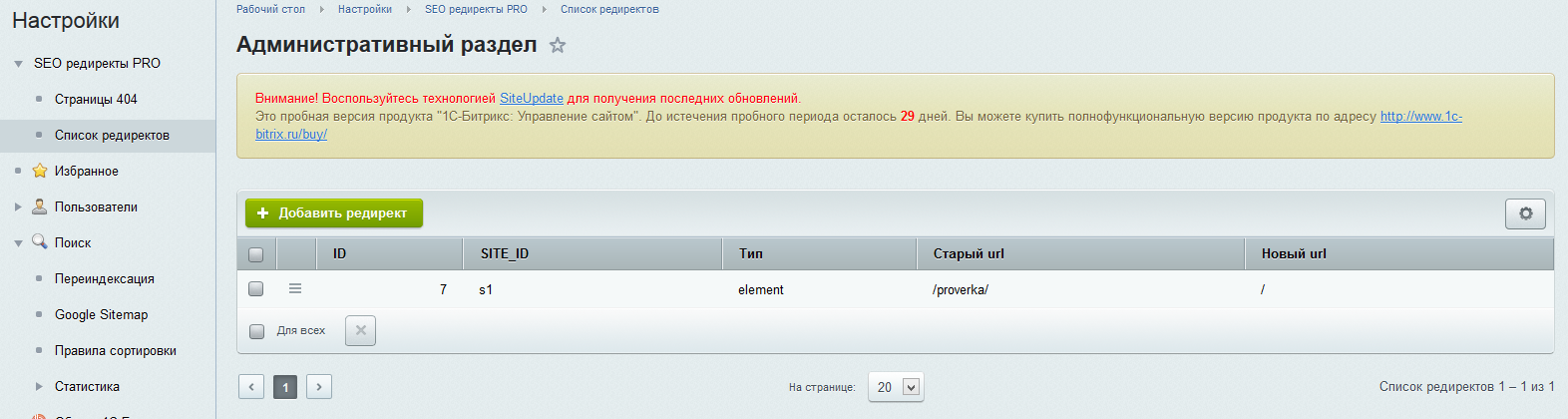 - Полный список таких соотношений хранится в административной панели во вкладке «Настройки» - «SEO-редиректы», где можно посмотреть все записи и удалить ненужные.