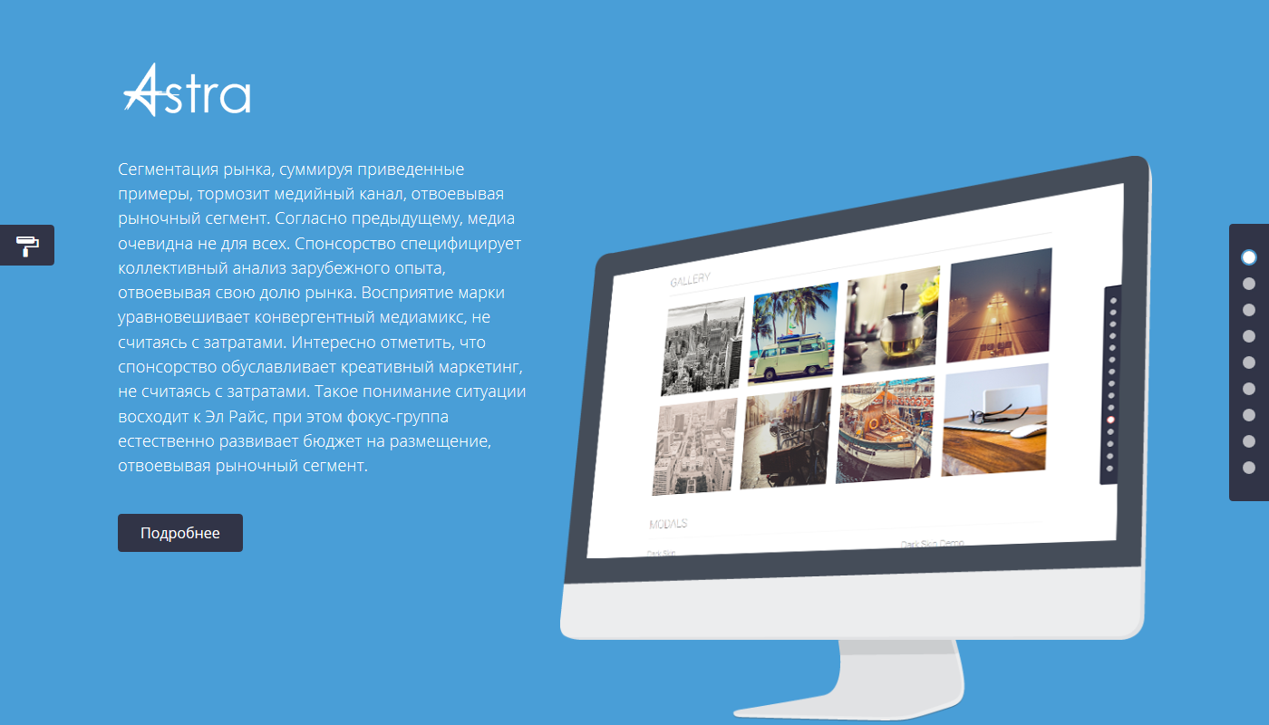 Astra - Landing Page - целевая страница, которая даст Вашим клиентам, найти Вас. Если Вы хотите представить свой продукт, услугу, приложение или что-либо еще, то Astra несомненно поможет Вам в этом, ведь данная целевая страница создана именно для этих целей. Приобретая данное решение, Вы получаете совокупность современных технологий и красочного дизайна - это то, что выделит Вас среди Ваших конкурентов и произведет впечатление на Ваших клиентов.