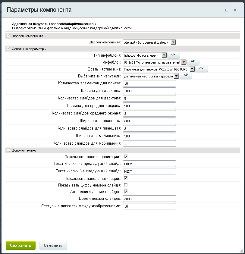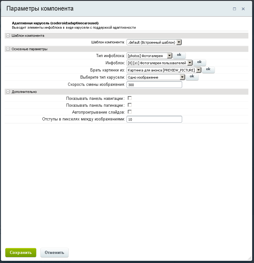 - Вывести в виде карусели изображения (включить или выключить появление кнопок навигации, пагинации, автосмены слайдов).