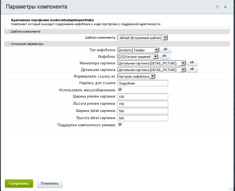- Если выбран пункт что необходимо использовать масштабирование изображений, то появляются дополнительные параметры для указания ширины и высоты для превью и полного изображения;