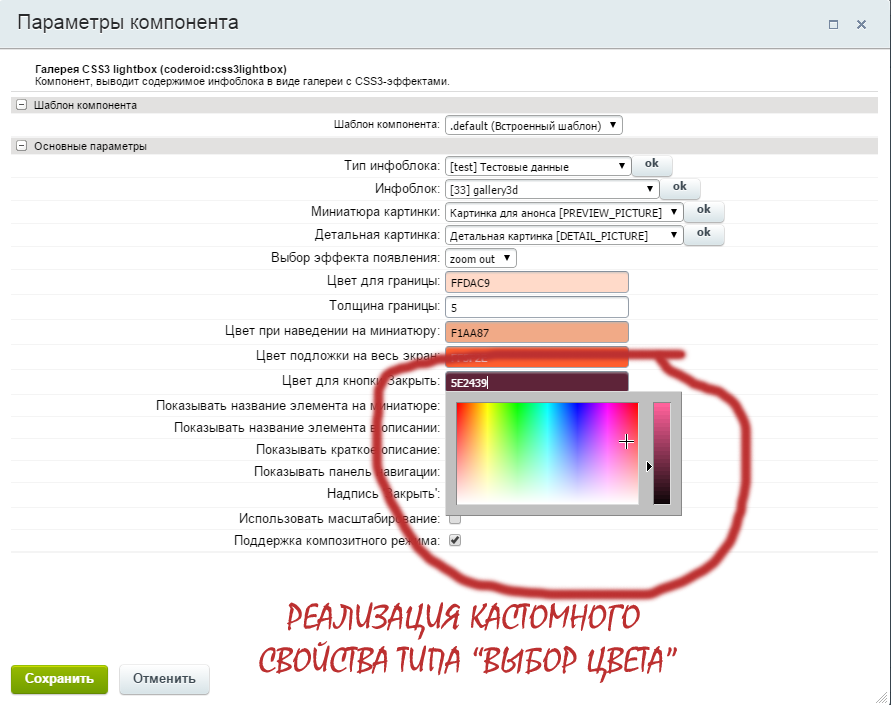 Также в компоненте реализовано пользовательское свойство (не входящее в поставку Битрикс) типа "Визуальный выбор цвета". |