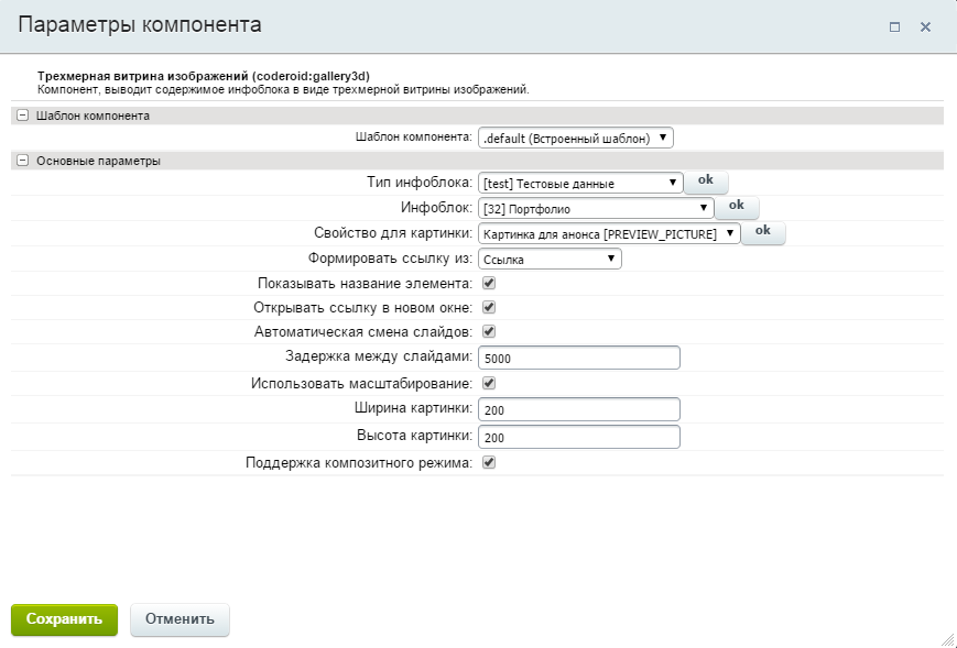 - Метод генерации ссылки при клике на изображение - из настроек инфоблока или из выбранного свойства (показывается список пользовательских свойств типа строка);