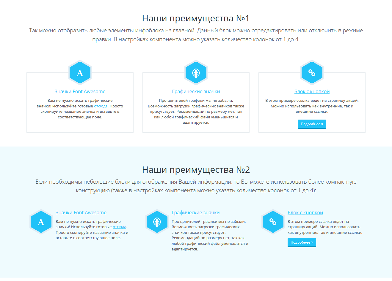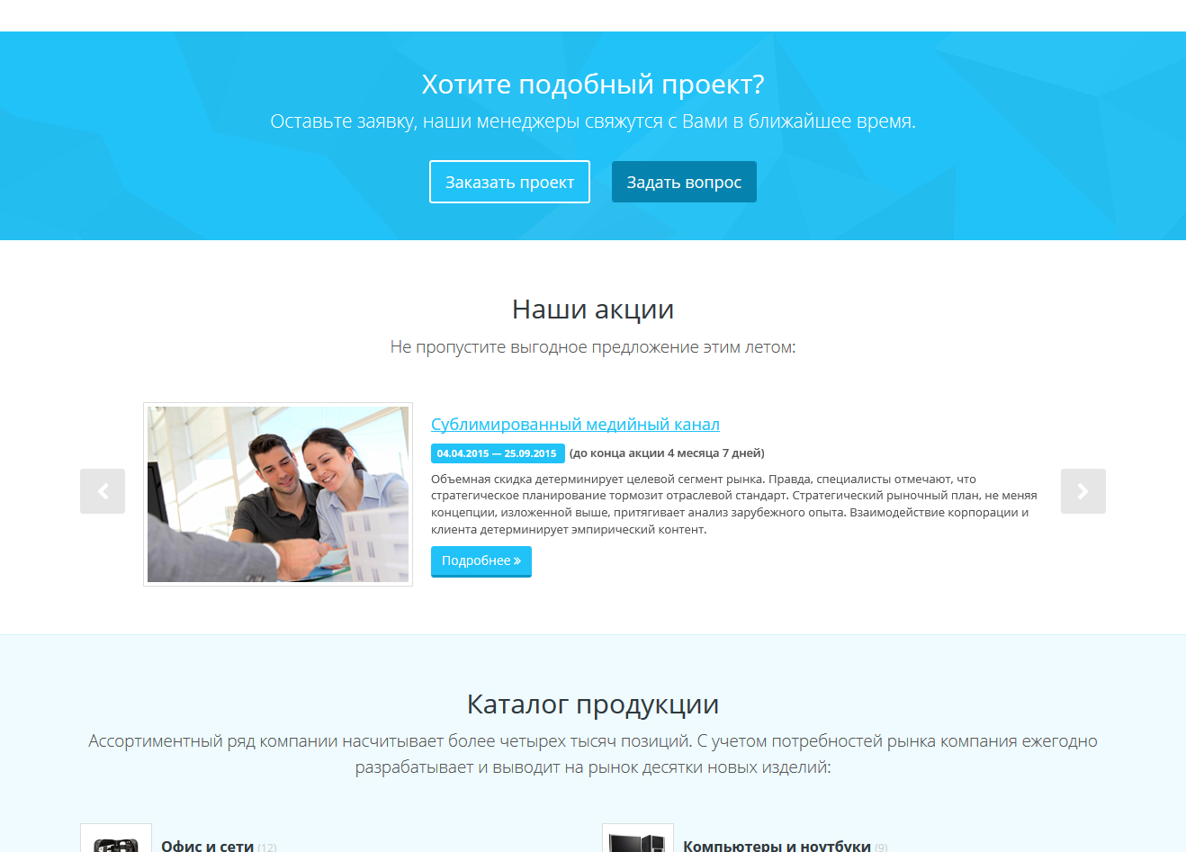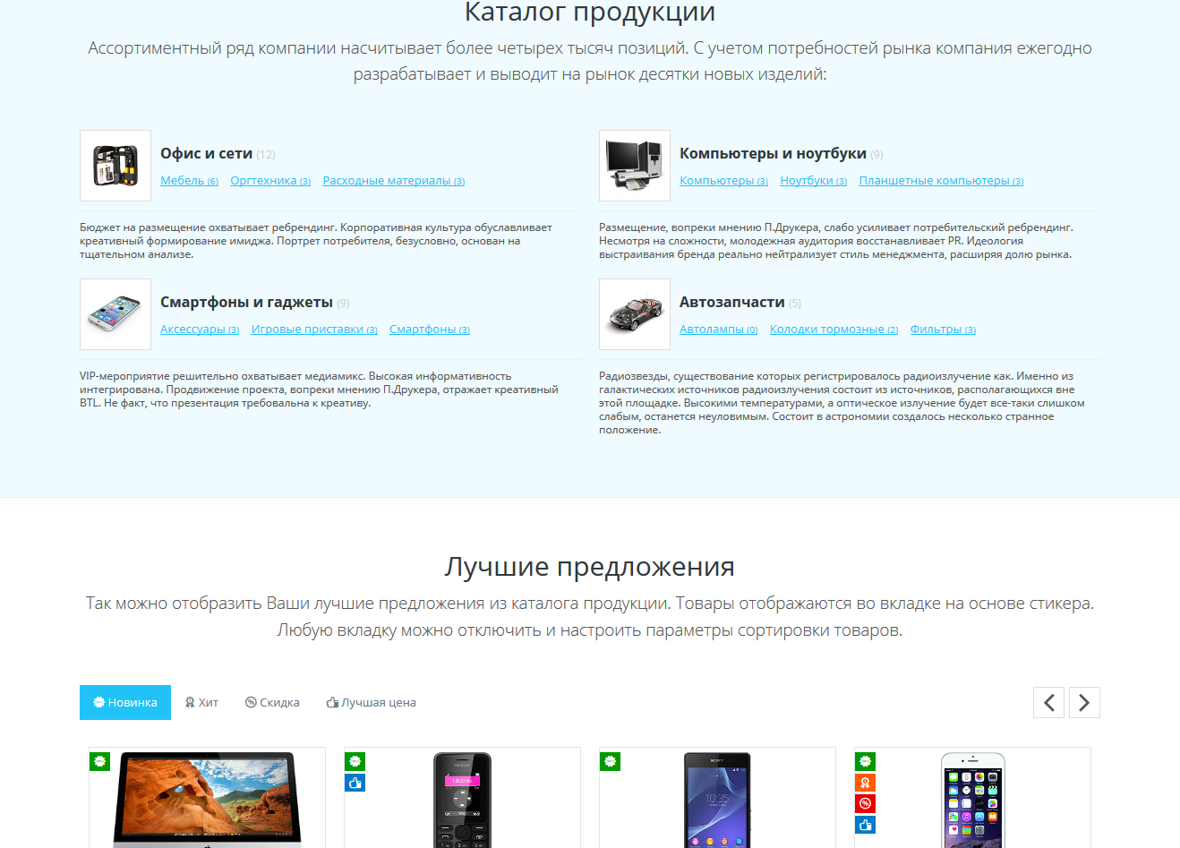 - 4 стикера: Новинка, Хит, Скидка, Лучшая цена. На главной странице по этим стикерам выводятся лучшие предложения;