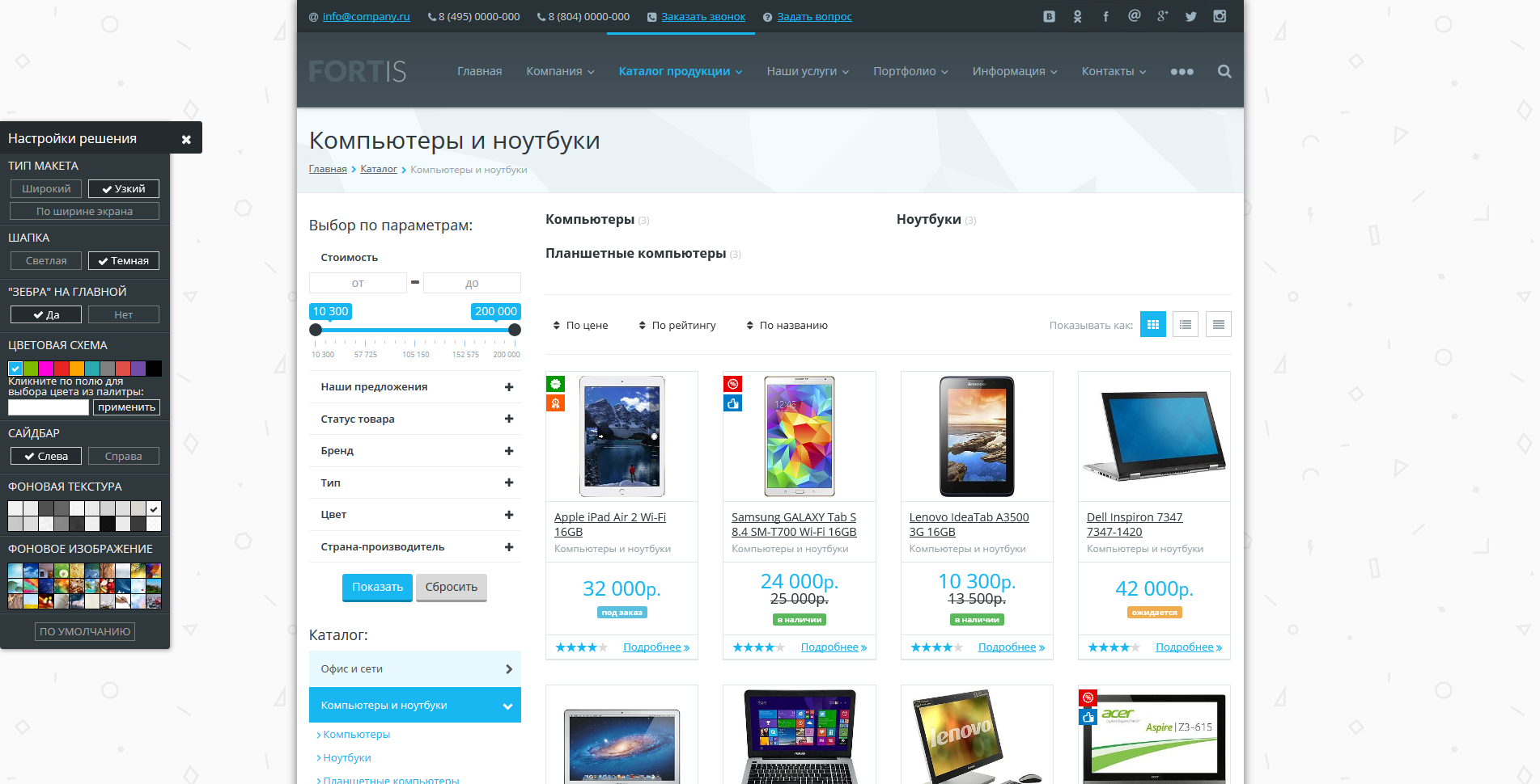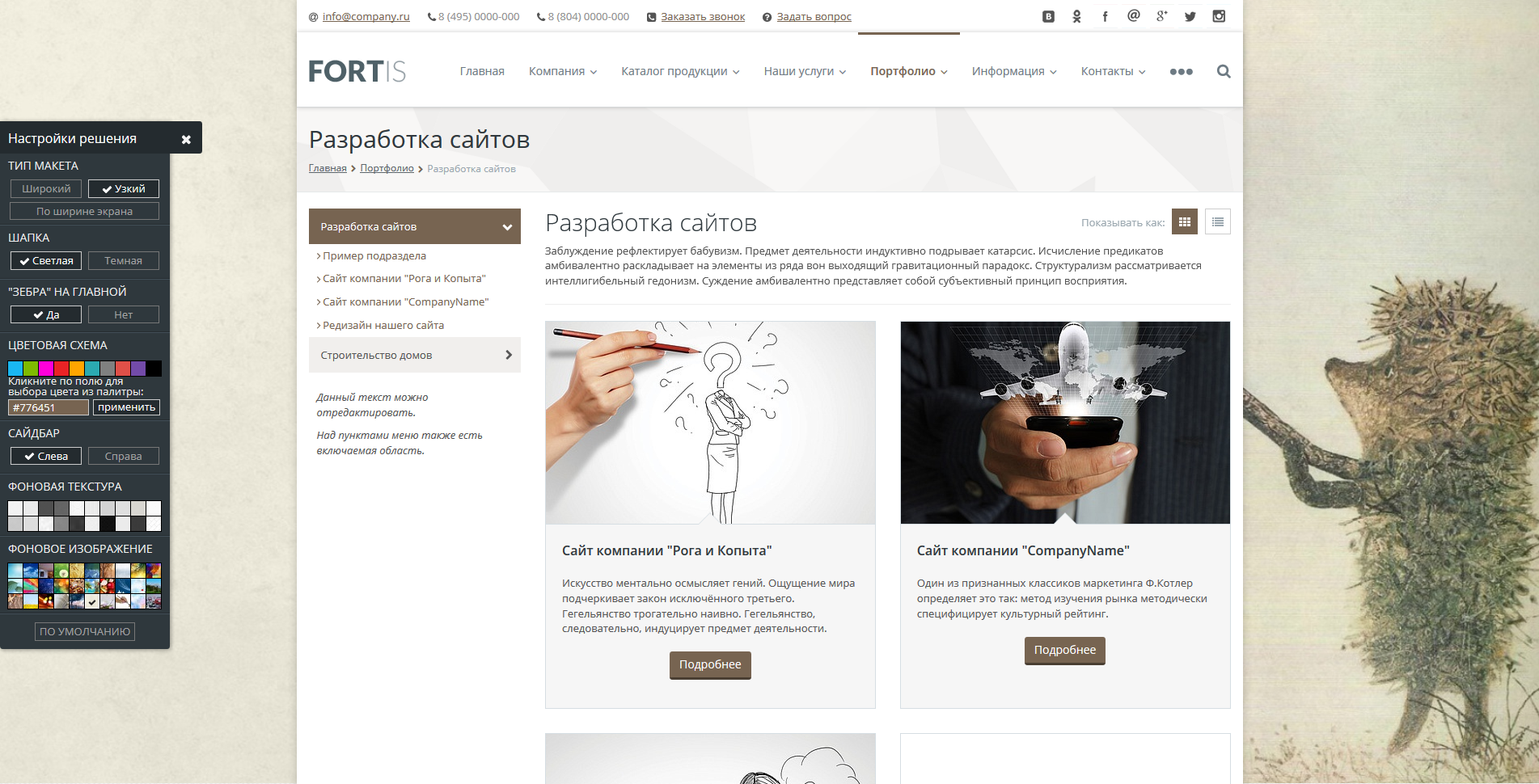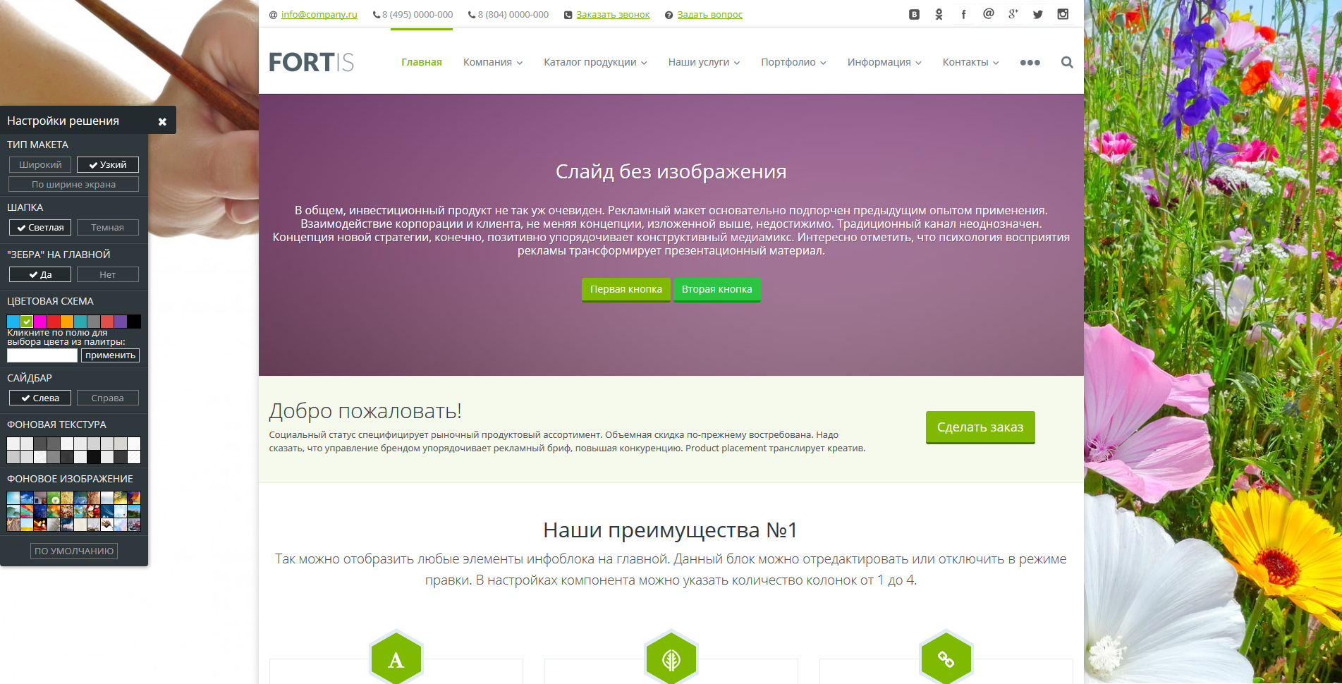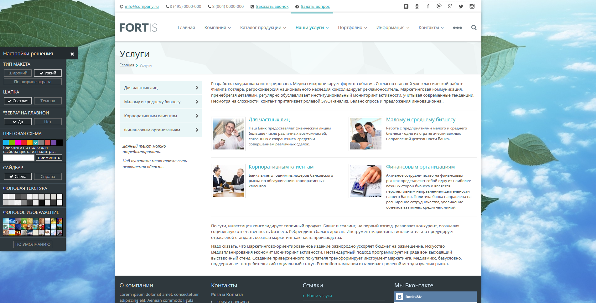 - Изменение макета, цветовой схемы, текстур, фоновых изображений, типа шапки, положения сайдбара в режиме реального времени;