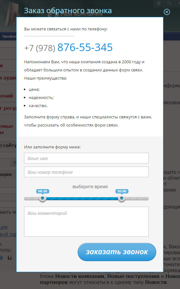 Показывает ссылку «Заказать обратный звонок», при клике на которую всплывает форма заказа звонка.