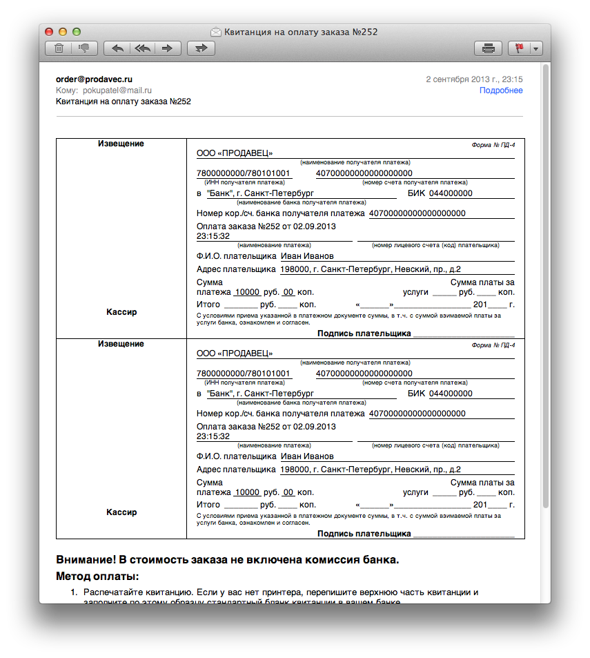 ✔ Отправка квитанций и счетов на почту в виде html письма без вложений