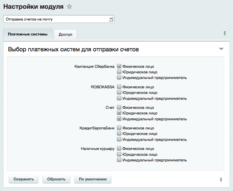 ✔ Быстрая настройка: отметьте галочками платежные системы, для которых нужно отправлять счета в настройках модуля, никаких других действий не требуется