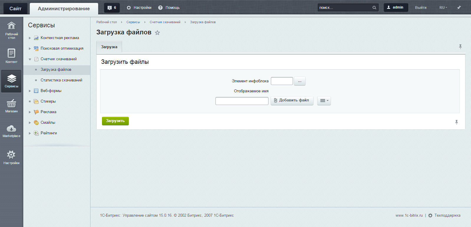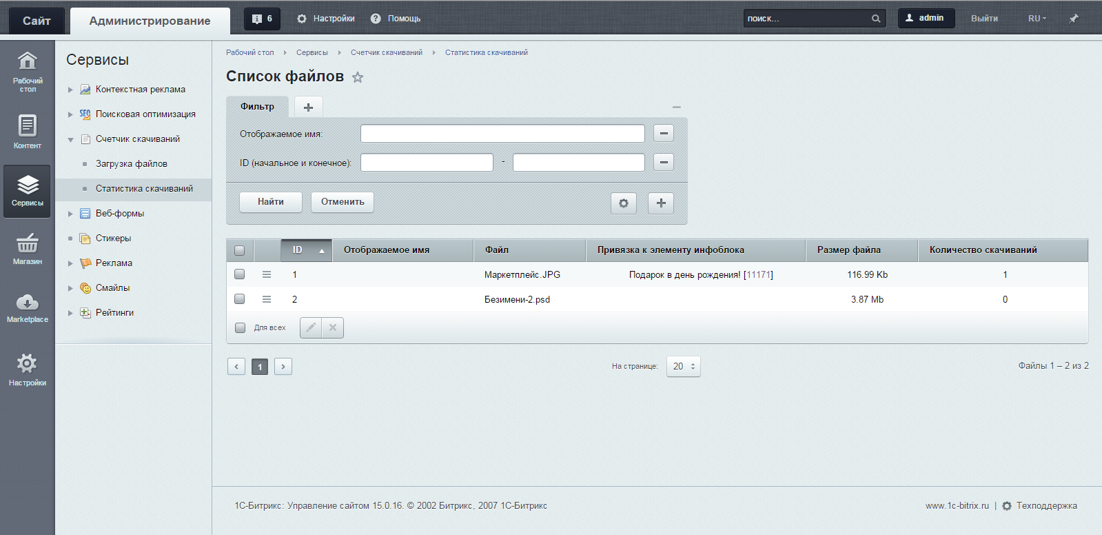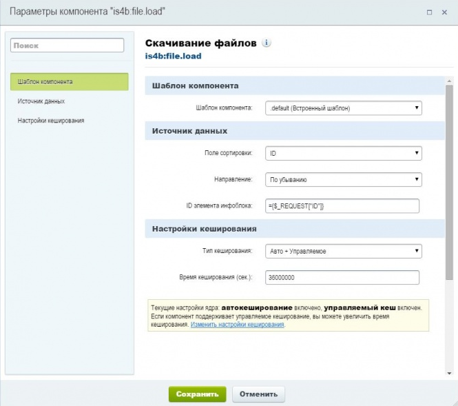 За отображение ссылок на файлы отвечает специальный компонент is4b:file.load, отображающий список файлов (ссылок) для скачивания по идентификатору элемента информационного блока. Компонент is4b:file.load.selected позволяет выбрать файлы на которые будут выводиться ссылки. Загрузить файлы и посмотреть статистику по скачиваниям можно в разделе Сервисы-Счетчик скачиваний в административной части сайта.
