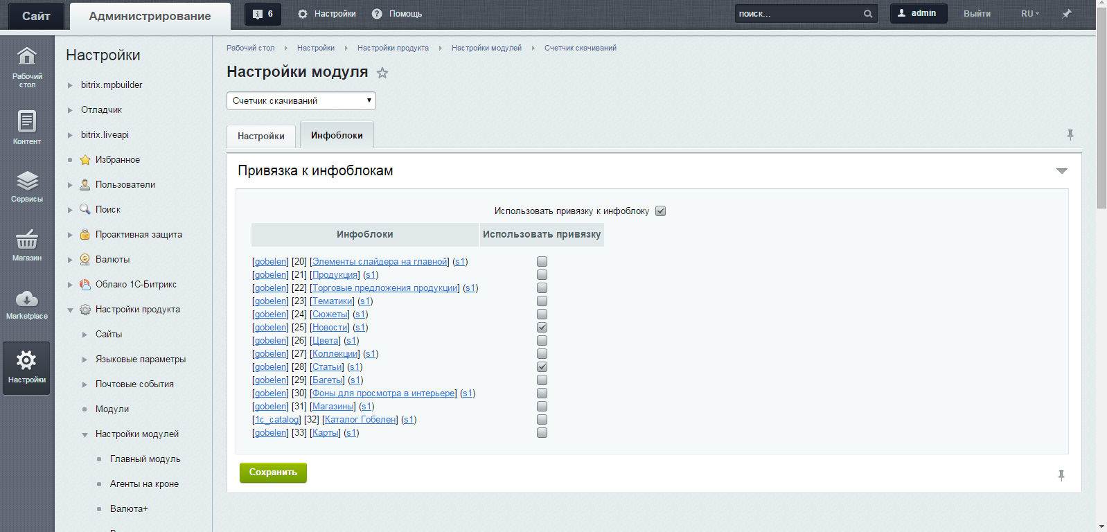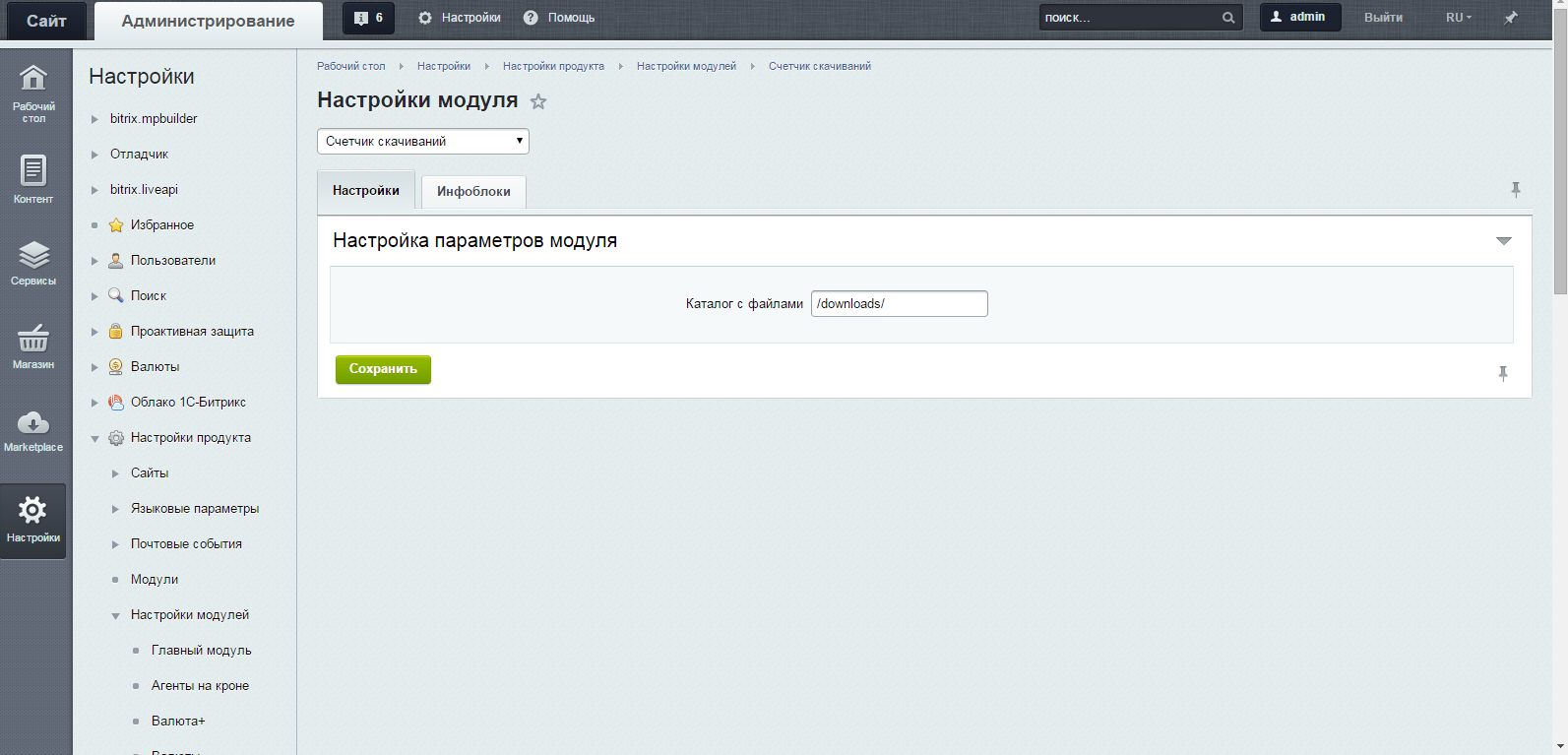 В качестве основных настроек модуля необходимо указать каталог, в котором будут храниться файлы и отметить информационные блоки, к которым будет осуществляться привязка, после чего с ним можно работать.