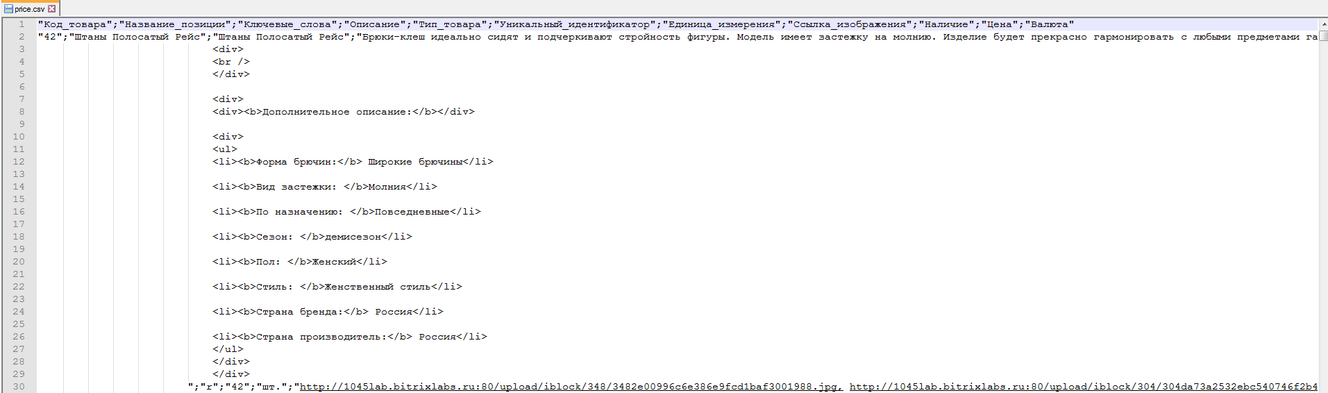 ссылка на изображения (происходит выбор детальной картинки товара + выбор изображения из множественного свойства), наличие выгружается («+» - в наличии, «-» - нет в наличии).