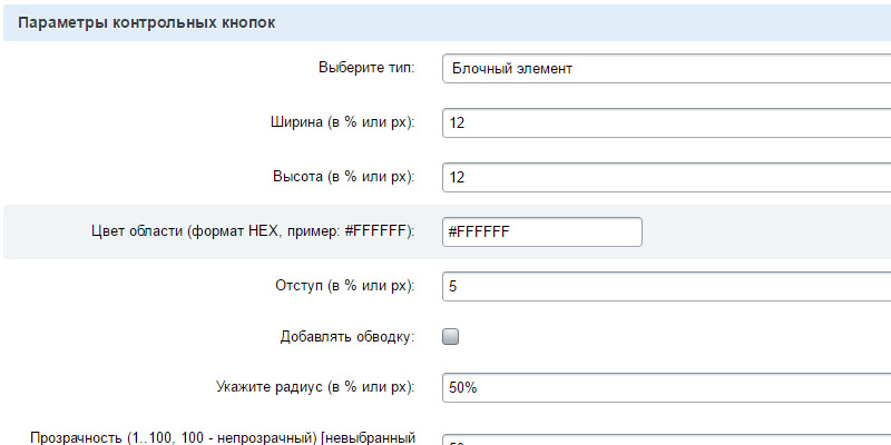 - Параметры контрольных кнопок. Необходимо выбрать тип (Отключить/Изображение/Блочный элемент.****