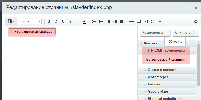 - Картинка и описание слайдера берется из анонса. Заголовок - это название создаваемого элемента.