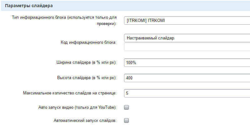 - ИБ создается автоматически при установке модуля. Название типа ИБ –> «ITRKOMI», название ИБ -> «Настраиваемый слайдер».