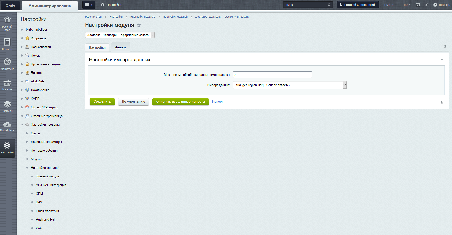 Переходим на вкладку «Импорт» и в том порядке что указано в селекте «Импорт данных»: