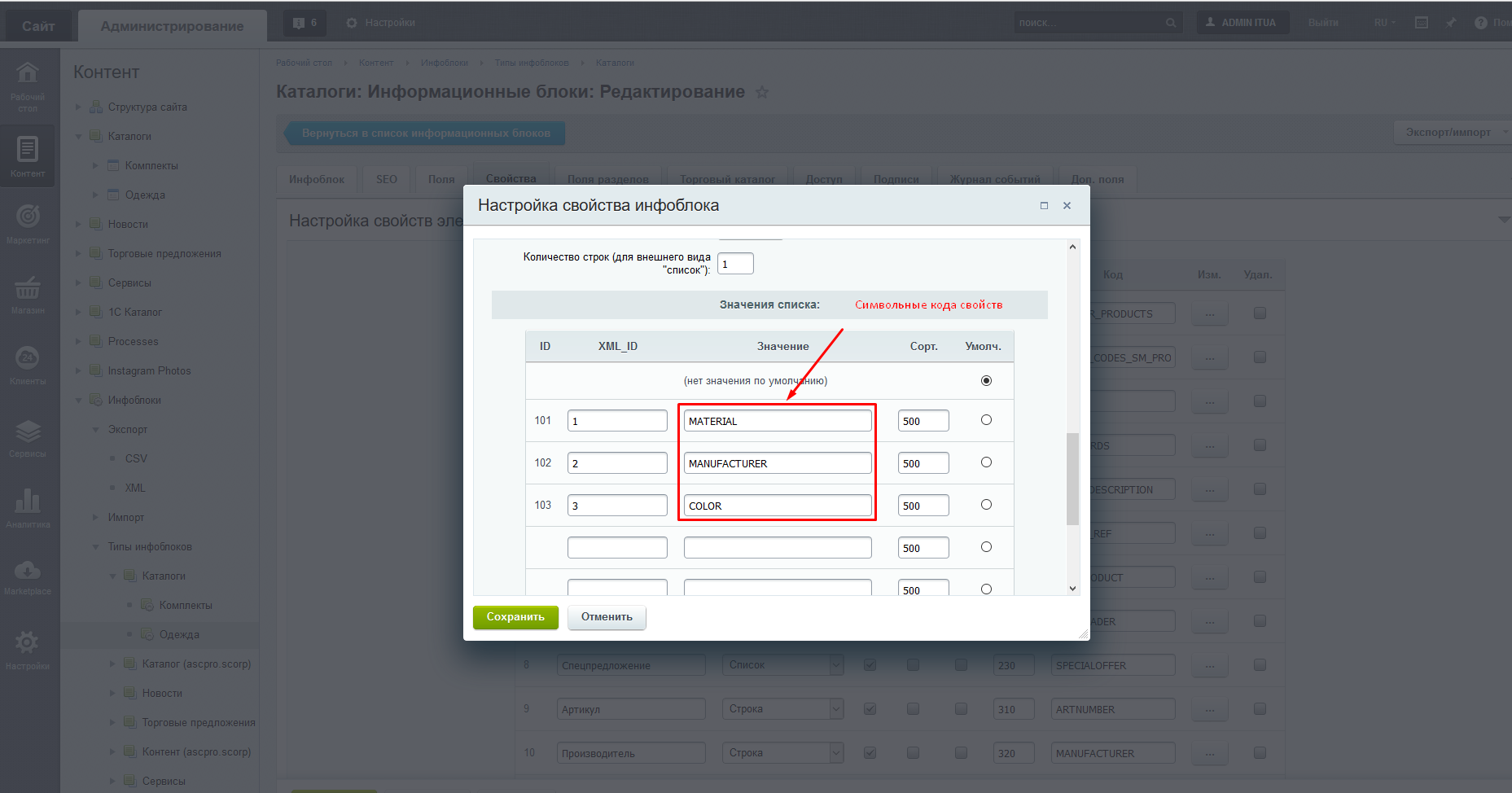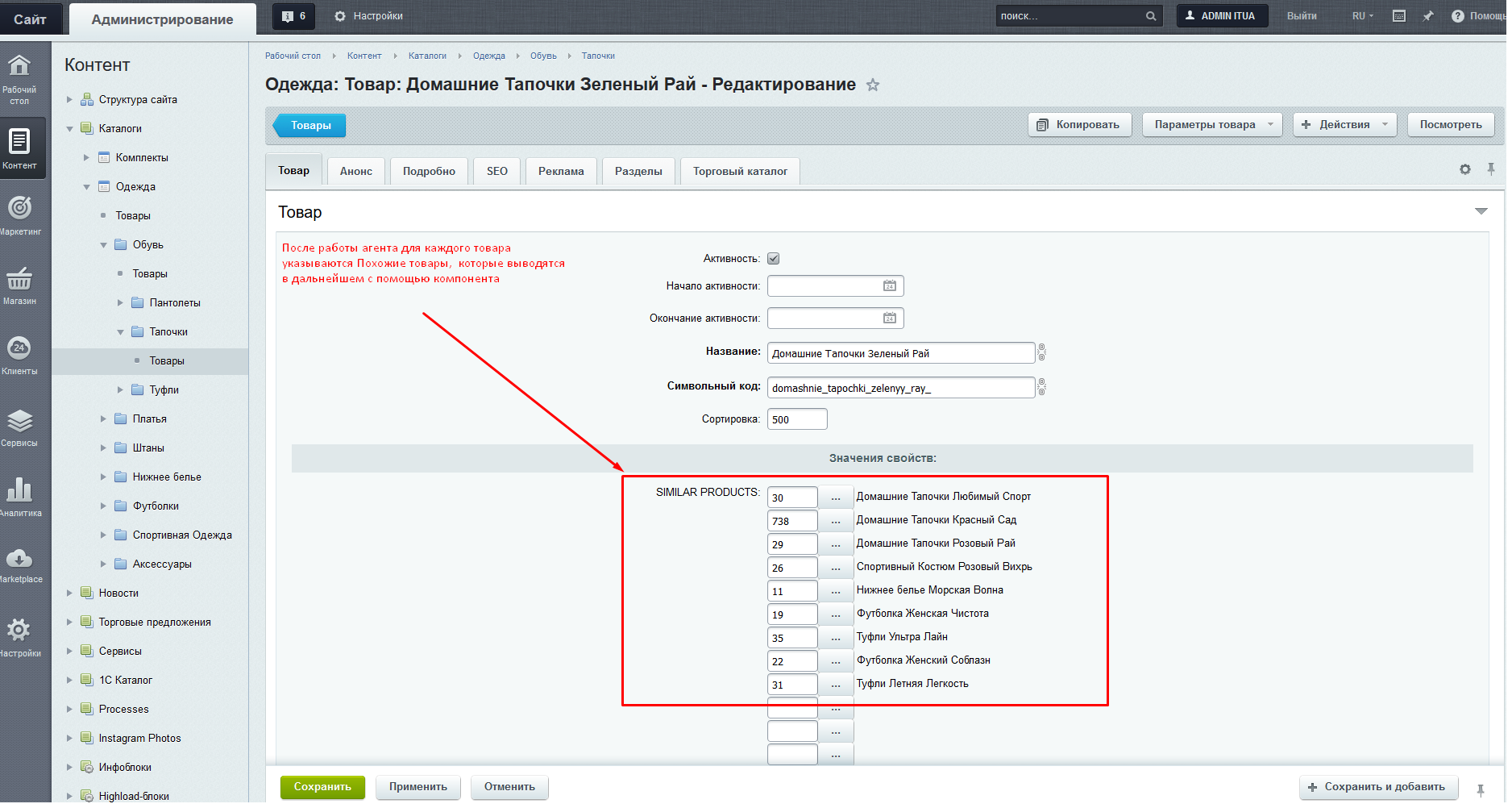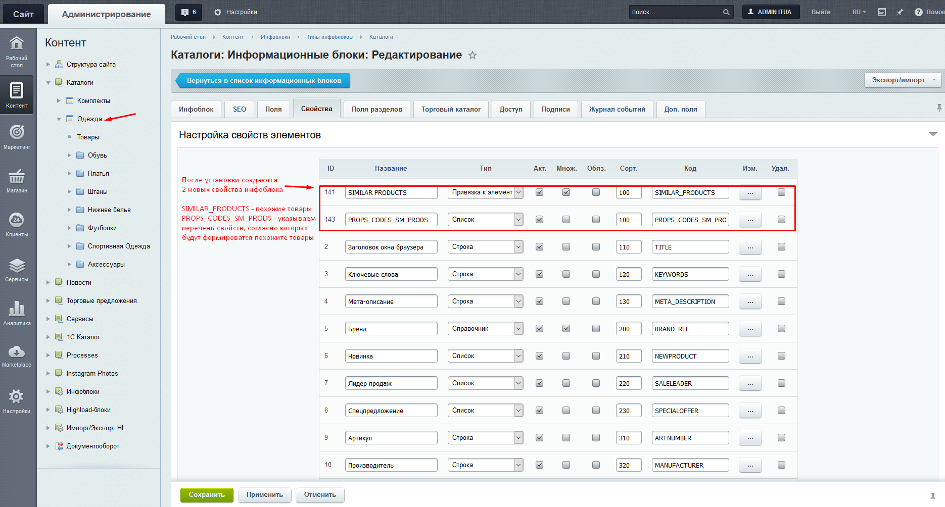 При установке создается свойство «SIMILAR PRODUCTS», где будет храниться перечень похожих товаров для конкретного товара и «PROPS_CODES_SM_PRODS» - свойство, куда нужно прописать символьные кода свойств по которым будут отбираться похожие товары.
