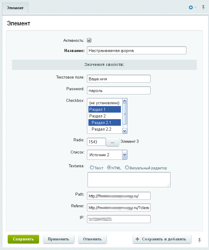 - возможность задать название для создаваемого элемента инфоблока в настройках компонента - позволяет различать результаты сохранения различных форм в одном инфоблоке.