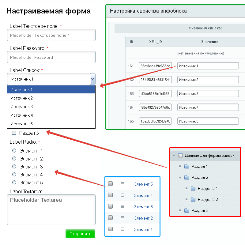 - select, checkbox, radio - списки формируются из значений свойств типов список, привязка к разделам инфоблока, привязка к элементам инфоблока