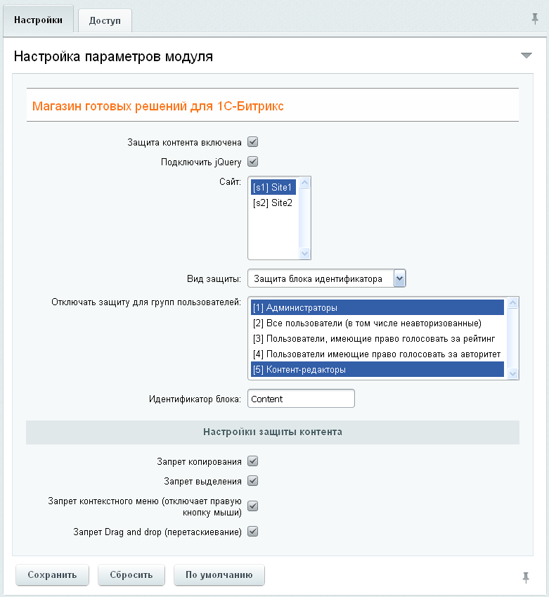 - Защита блока идентификатора - можно указать идентификатор (id) блока, используемого в верстке сайта, который необходимо защитить.
