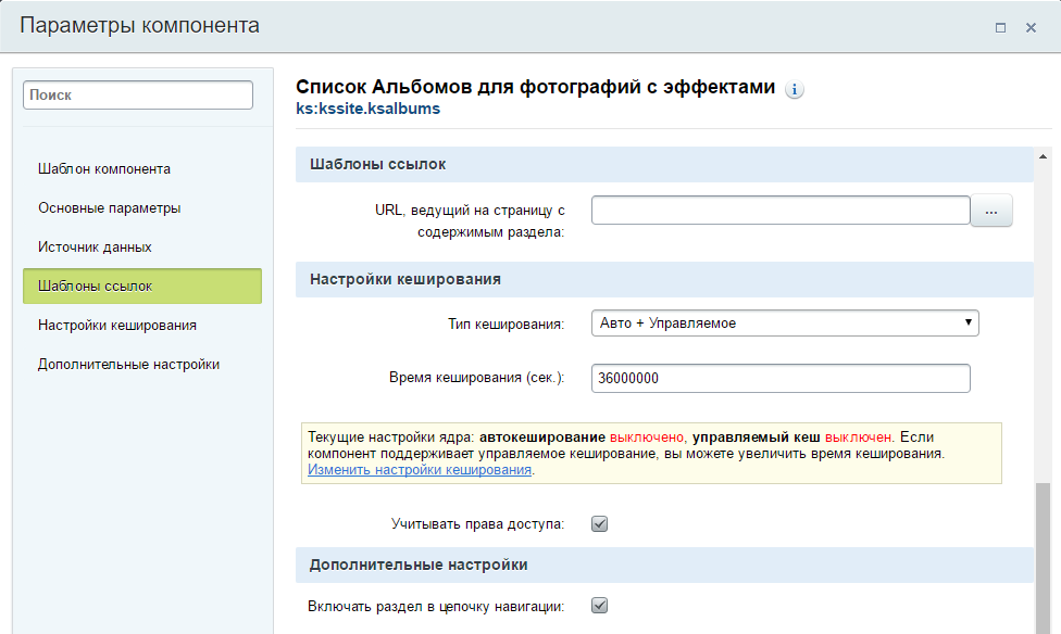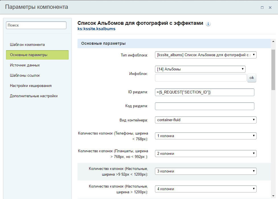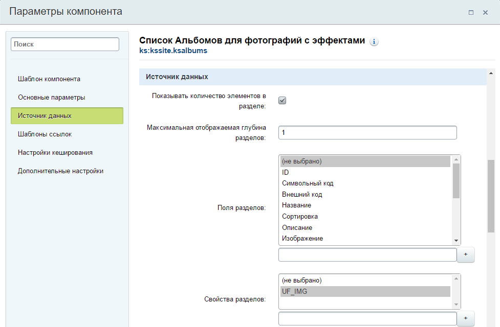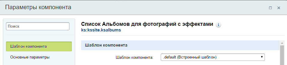 2. Настройки Компонента: Список Альбомов для фотографий с эффектами (kssite.ksalbums) - Выводит список альбомов для фотографий: