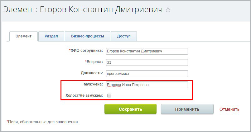 Рассмотрим пример. Допустим, есть инфоблок, содержащий первичную информацию о новых сотрудниках или кандидатах. Для каждого элемента необходимо заполнить поля: ФИО, возраст, должность, муж/жена. Если сотрудник холост/не замужем, то он может нажать соответствующий чекбокс и поле «Муж/жена» будет скрыто.