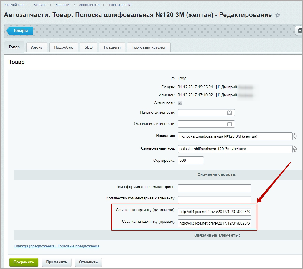 - «Из какого свойства берем» — код свойства инфоблока, в котором хранится ссылка на картинку. Например, для картинки анонса UF_PURL_PREVIEW, для детальной картинки — UF_PURL_DETAIL (коды, которые вы задали в свойствах инфоблока):