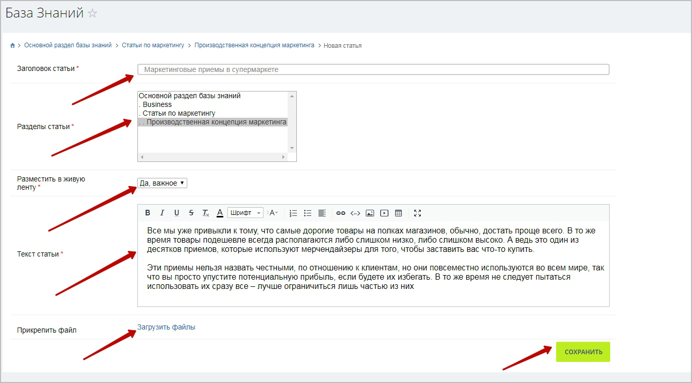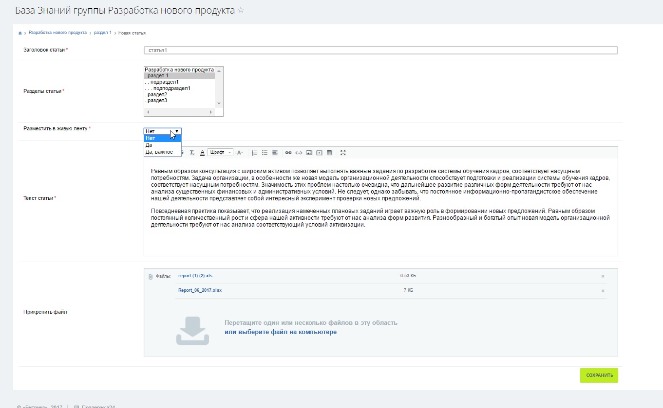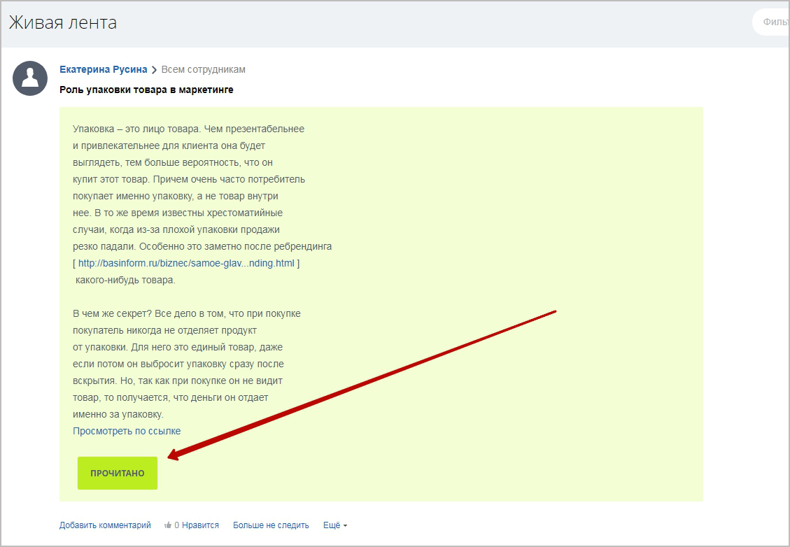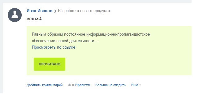 4. При публикации новой статьи можно указать дублирование в Живую ленту, а также пометку как важное. При пометке как важное, сообщение о публикации новой статьи выйдет в Живой лента отмеченным желтым цветом, и будет иметь кнопку Прочитано. Можно будет отследить, сколько сотрудников уже ознакомились с данной статьей.