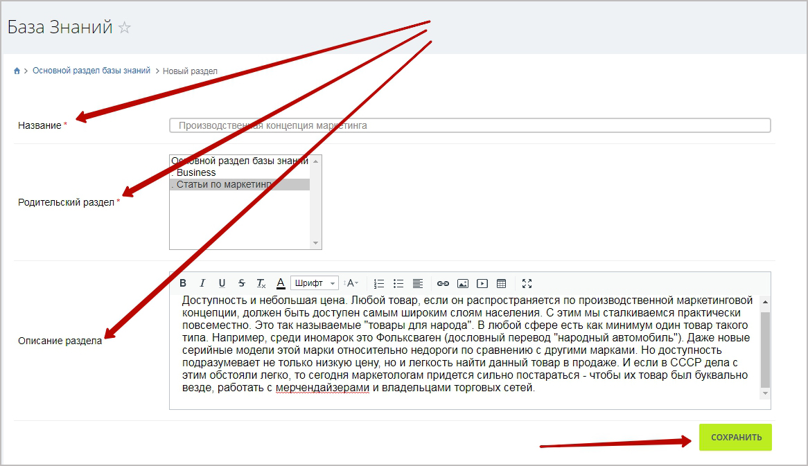 2. Заполните название раздела, выберите, будет ли он относиться к основному разделу Базы знаний или какому-либо подразделу.