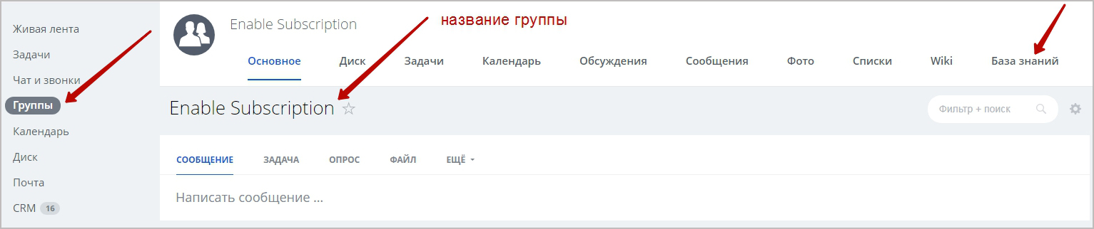 Для работы с базой знаний конкретной рабочей группы, зайдите в меню Группы — База знаний.
