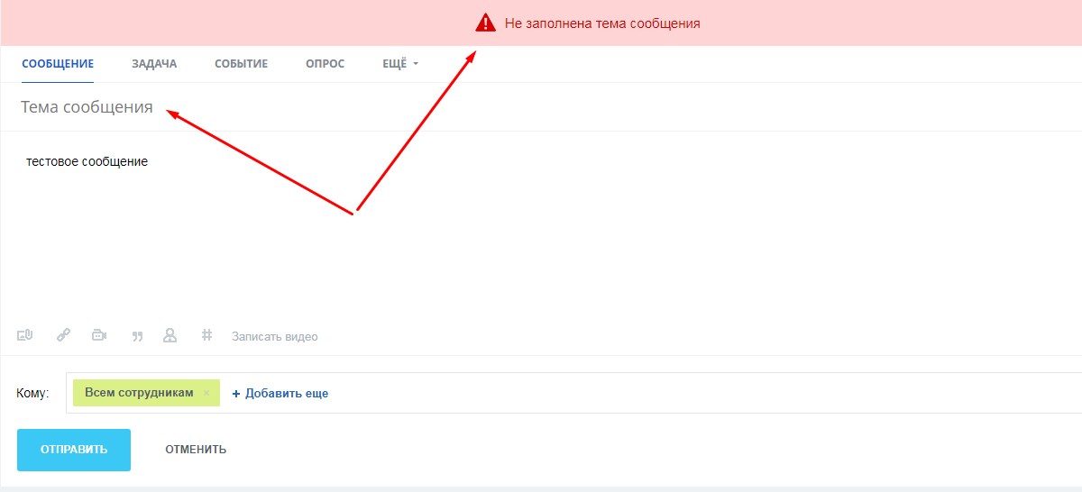 После установки модуля, если пользователь попробует отправить сообщение без указанной темы, выйдет ошибка: «Не заполнена тема сообщения». После указания темы сообщение можно будет опубликовать.
