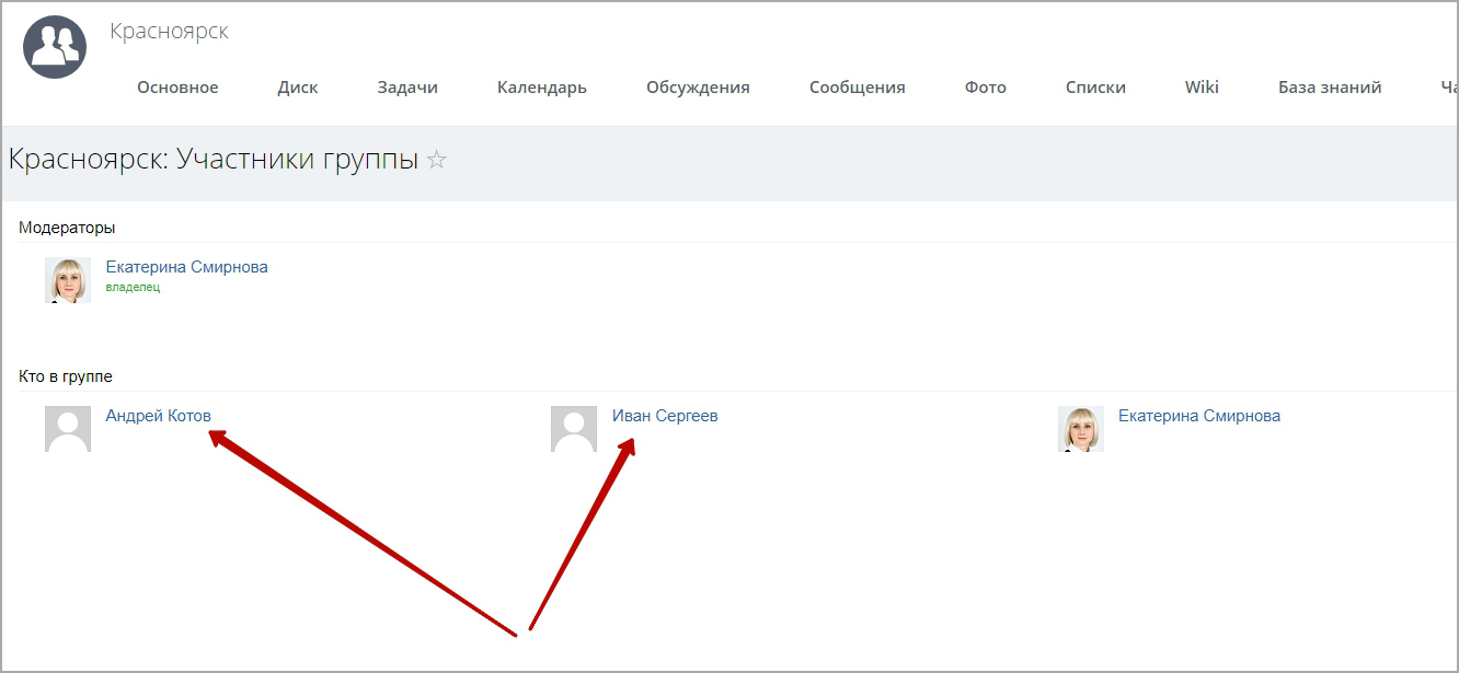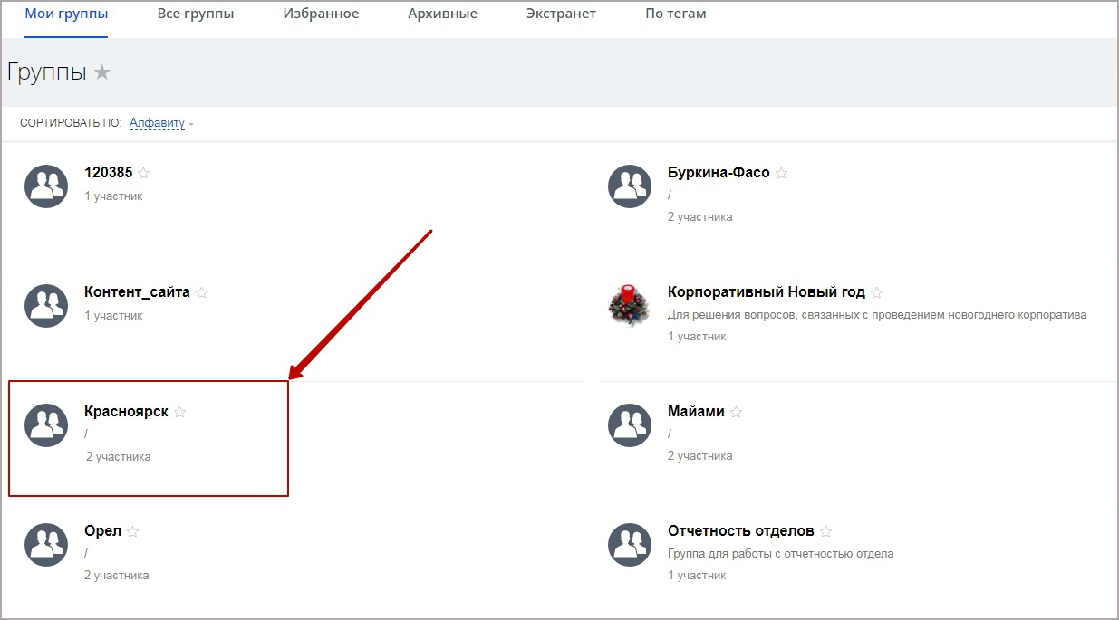 2. Если для города, указанного в карточке пользователя, существует рабочая группа на портале (см. скриншоты). Добавим еще одного пользователя в только что созданную группу. Новый пользователь с городом Красноярск был добавлен в соответствующую группу.