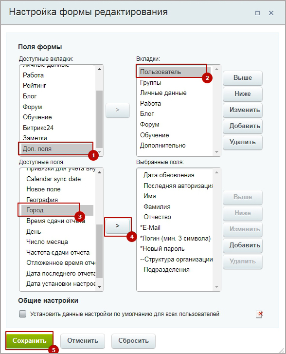 11. В открывшемся окне выберите "Поля формы" - "Доп. поля". В разделе "Вкладки" выберите "Пользователь". Далее из "Доступных полей" выберите созданное вами поле (в данном примере это "Город") и нажмите стрелку вправо, чтобы оно появилось в разделе "Выбранные поля". Нажмите Сохранить.