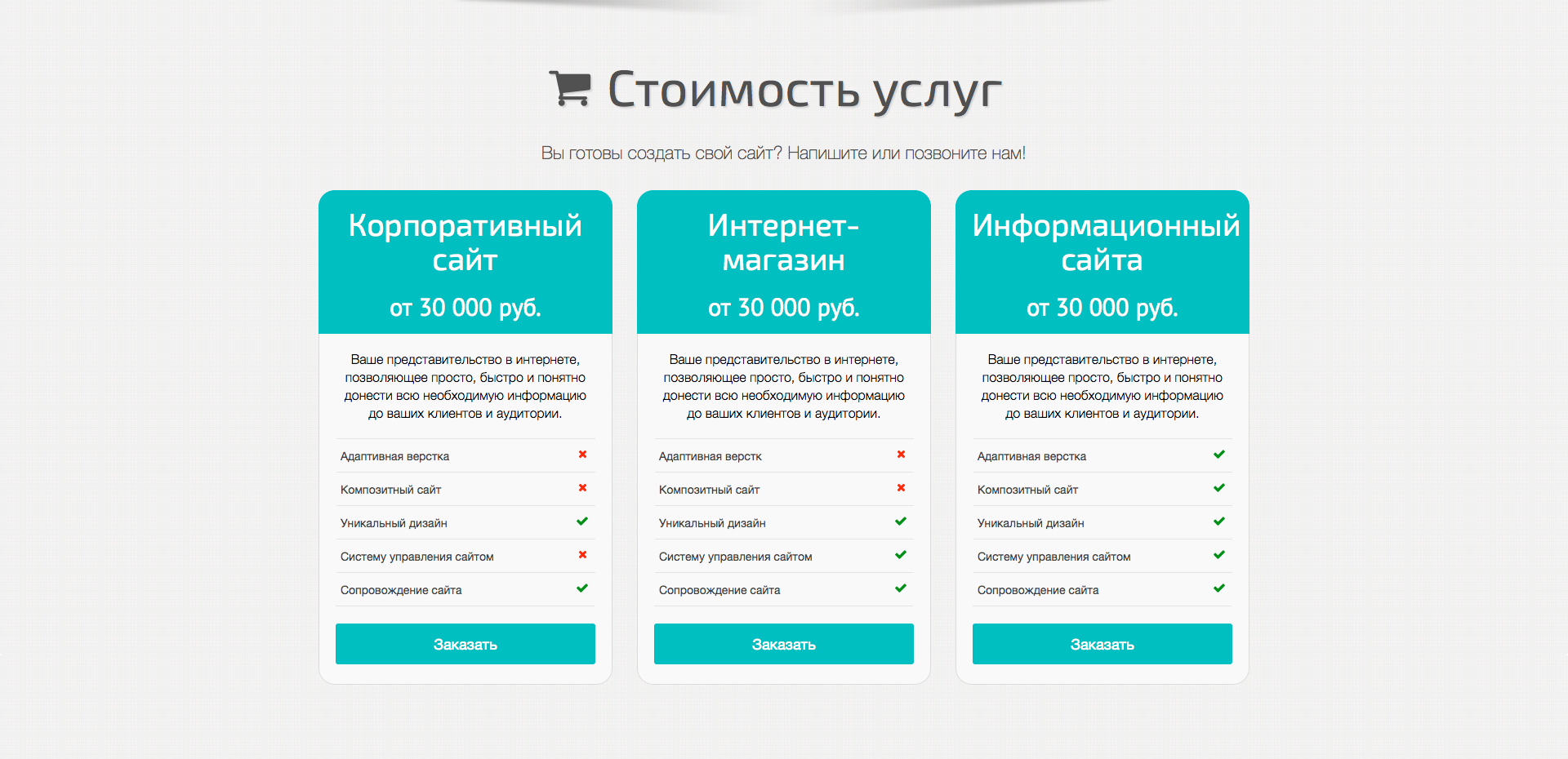 Блок «Стоимость услуг» - В данном блоке Вы сможете разместить информацию об услугах предоставляемых Вашей компанией с указанием стоимости и описанием, а также наглядно показать чем отличаются услуги друг от друга.