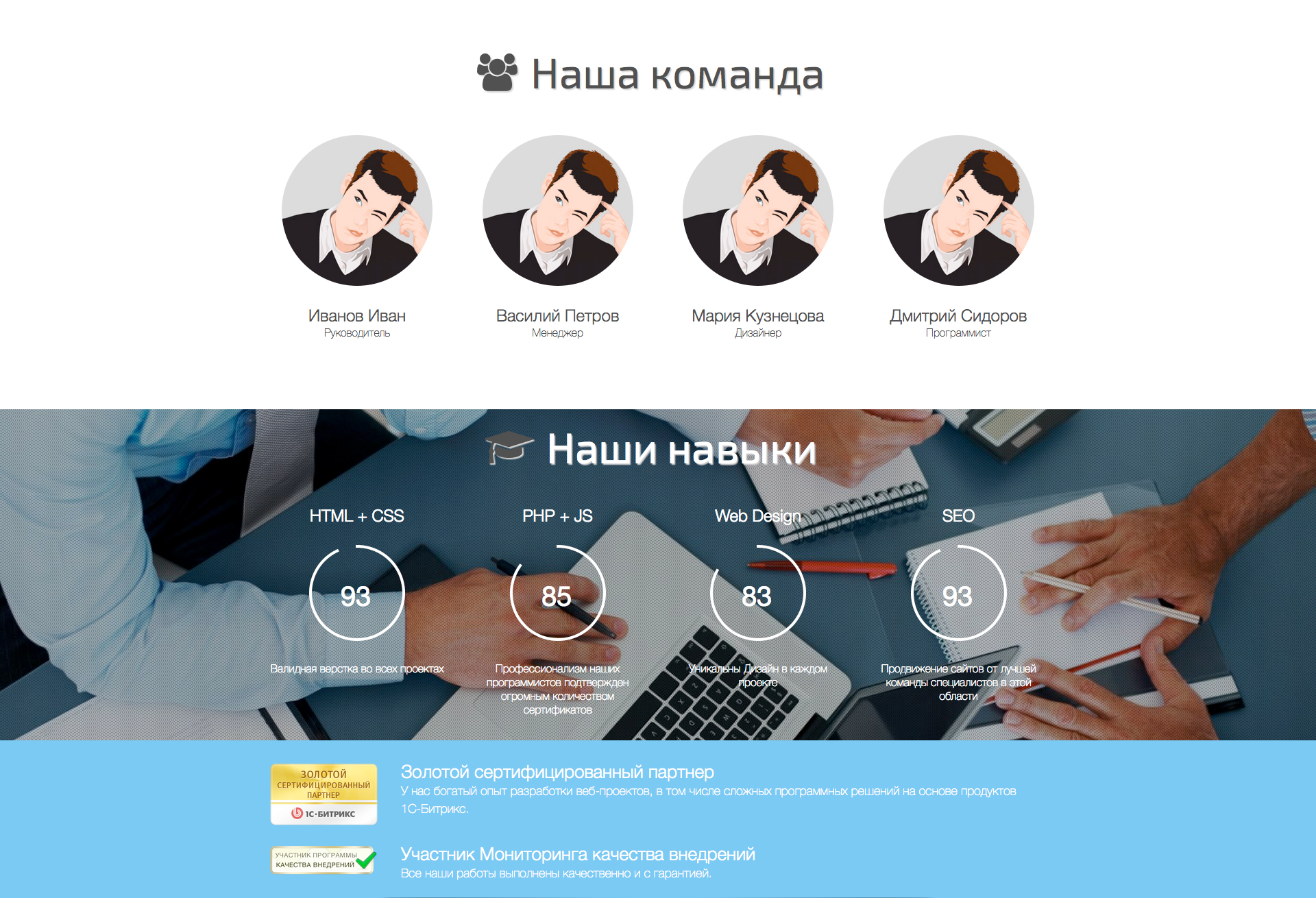 Блок «Наша команда» - В данном блоке Вы сможете разместить фотографии Ваших сотрудников с указание их ФИО и должности.