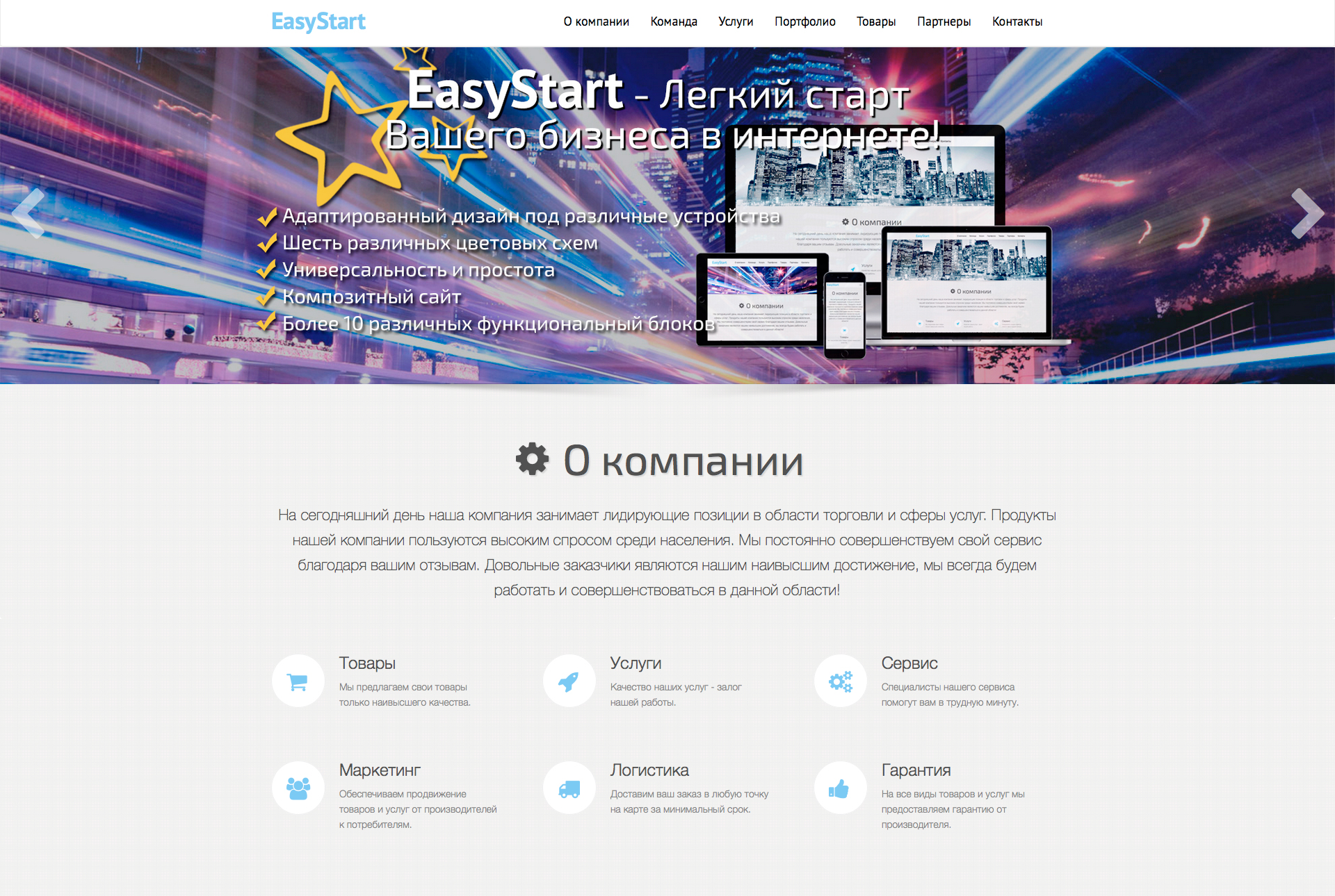 EasyStart - адаптирован под различные устройства и разрешения экранов, поддерживает все современные версии браузеров, режим «Композитный сайт», универсальность и наличие шести цветовых схем помогут легко адаптировать сайт под тематику Вашего бизнеса.