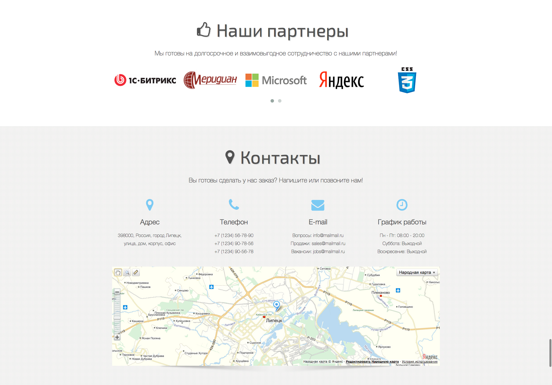 Блок «Контакты» - В данном блоке Вы сможете разместить полную контактную информацию Вашей компании (адреса, телефоны, e-mail, расположение на карте).
