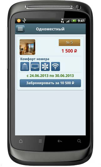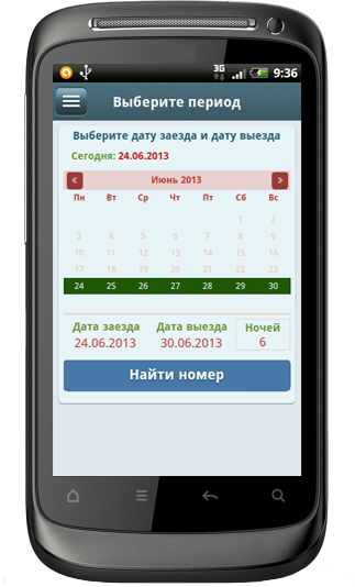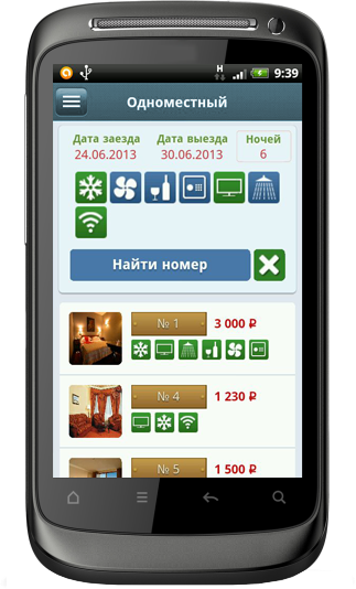 В приложении реализован удобный механизм быстрого выбора периода проживания с отбором номеров по признакам (телевизор, кондиционер, сейф и т.д.). Каждой гостинице своим клиентам администрация должна установить данное решение и постоянных клиентов в вашей гостинице станет больше.