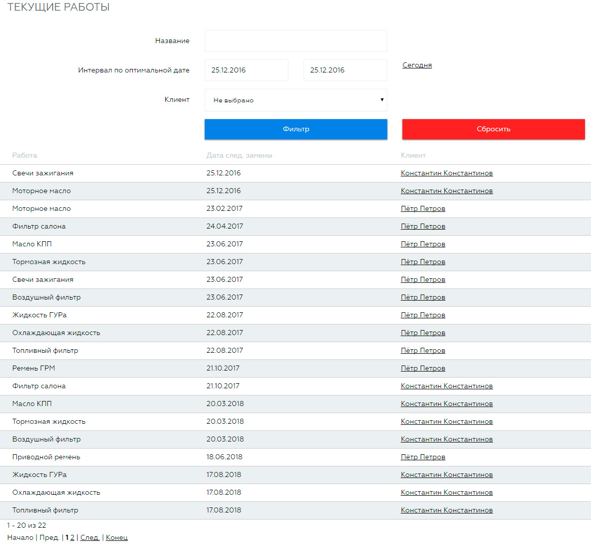 С помощью второго компонента можно отслеживать текущие работы. Можно отфильтровать по наименованию работ, дате и клиенту.
