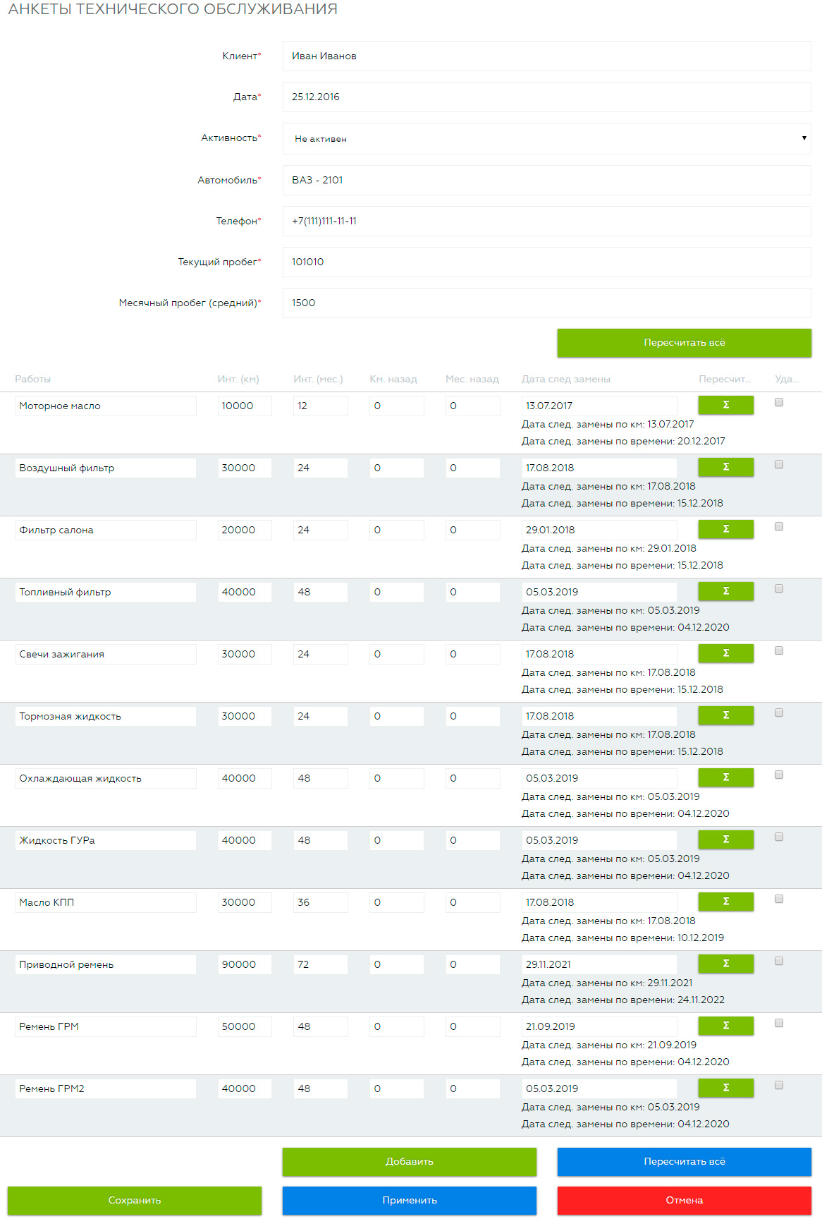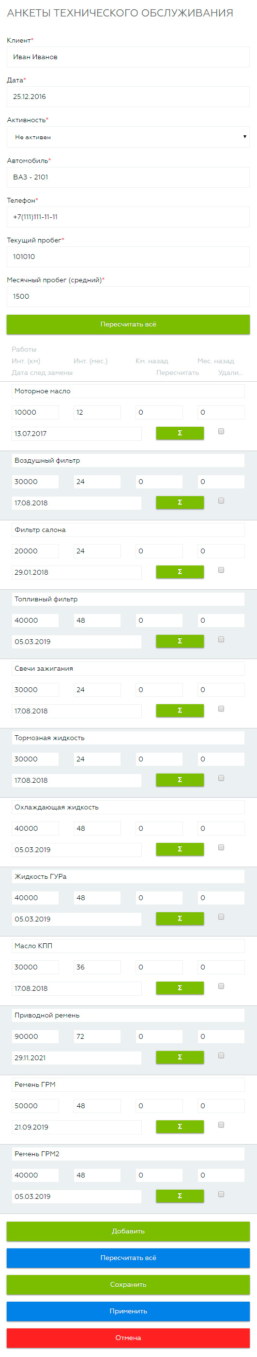 В настройках модуля можно изменить/добавить/удалить дефолтные настройки работ (интервал замены по пробегу и времени, сколько месяцев или километров назад была произведена определённая работа).