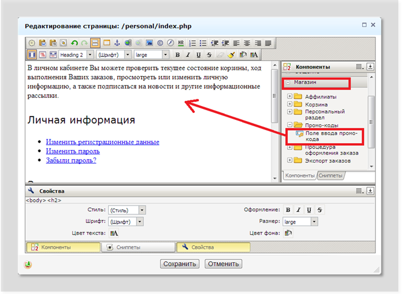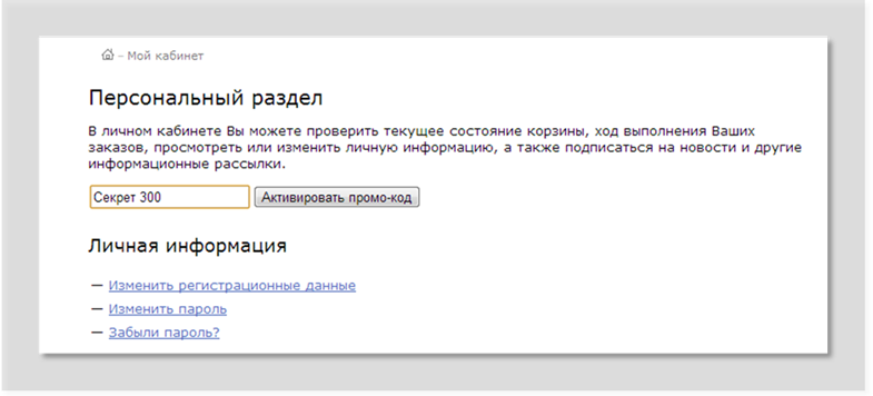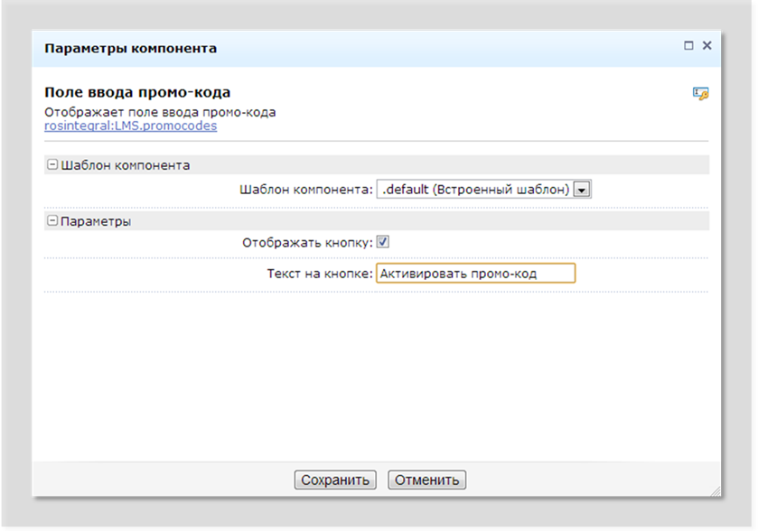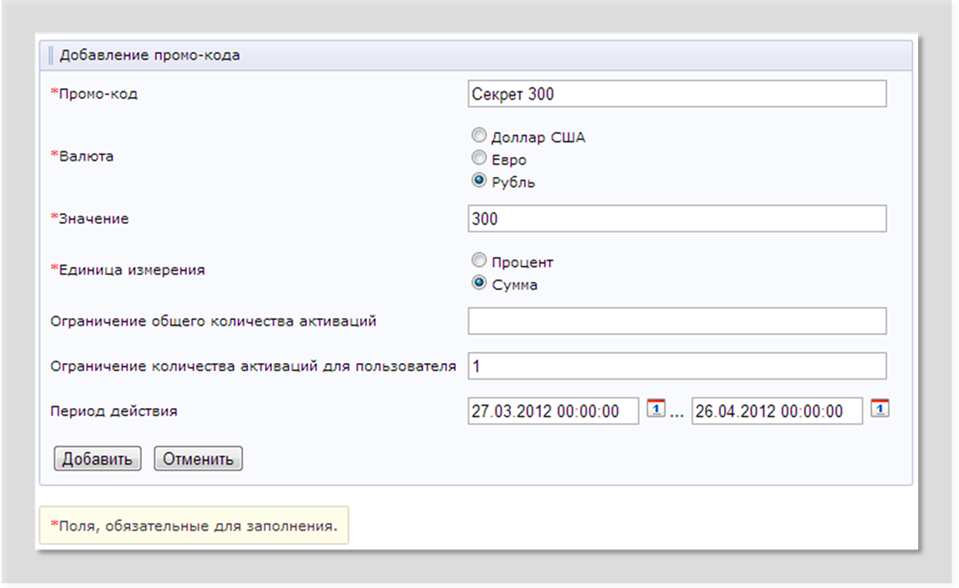 - промокод может вводиться пользователем на любой странице, где размещен компонент «Поле ввода промокода». Чаще всего промокоды вводятся при регистрации пользователя (зачисляется некоторая сумма на счет нового пользователя) и в личном кабинете пользователя (пополнение баланса промокодом);