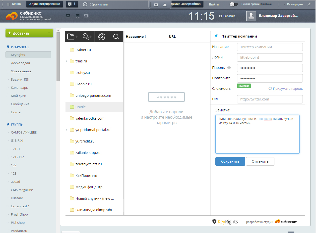 - Удобное хранение паролей. Логин, пароль, ссылка на проект и список допущенных к проекту сотрудников — все хранится в одной редактируемой карточке проекта.