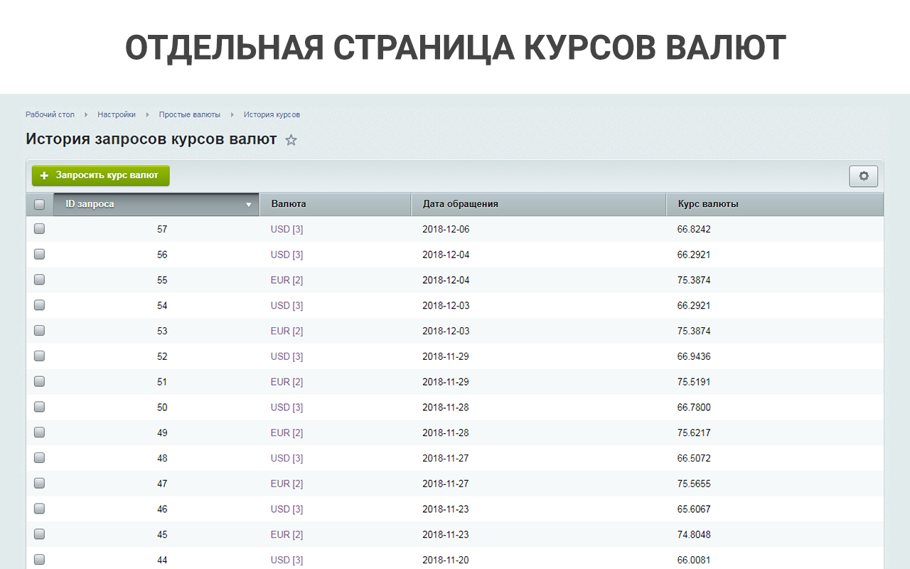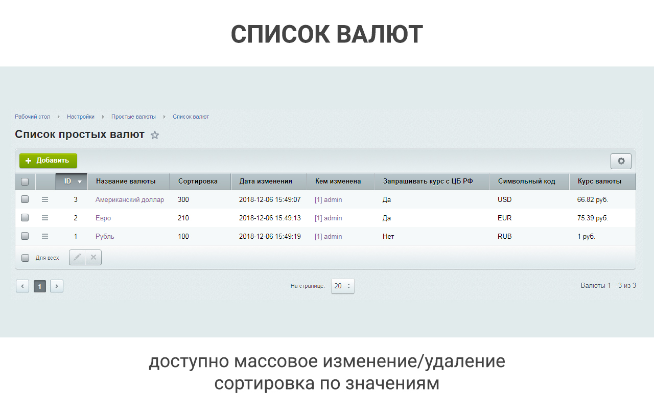Решение позволяет хранить информацию о стоимости товаров/услуг в иностранной валюте и отображать их конвертированное значение в основной валюте на сайте. Для данных валют устанавливается курс по отношению к основной валюте (руб.) или иной другой, которую необходимо использовать.