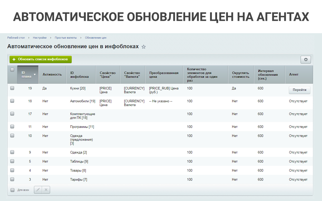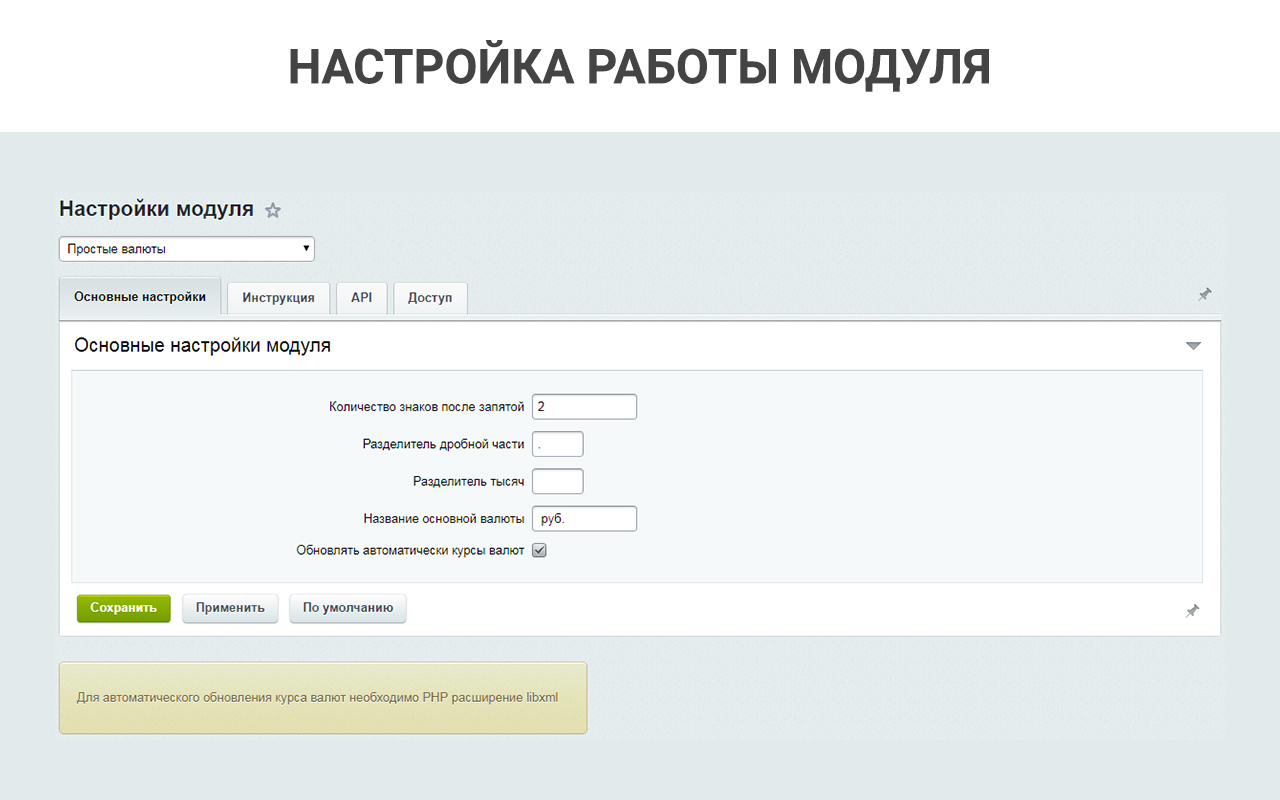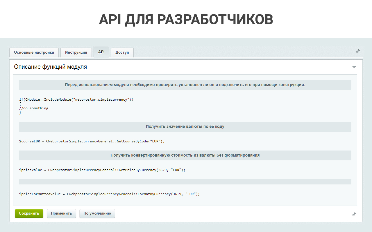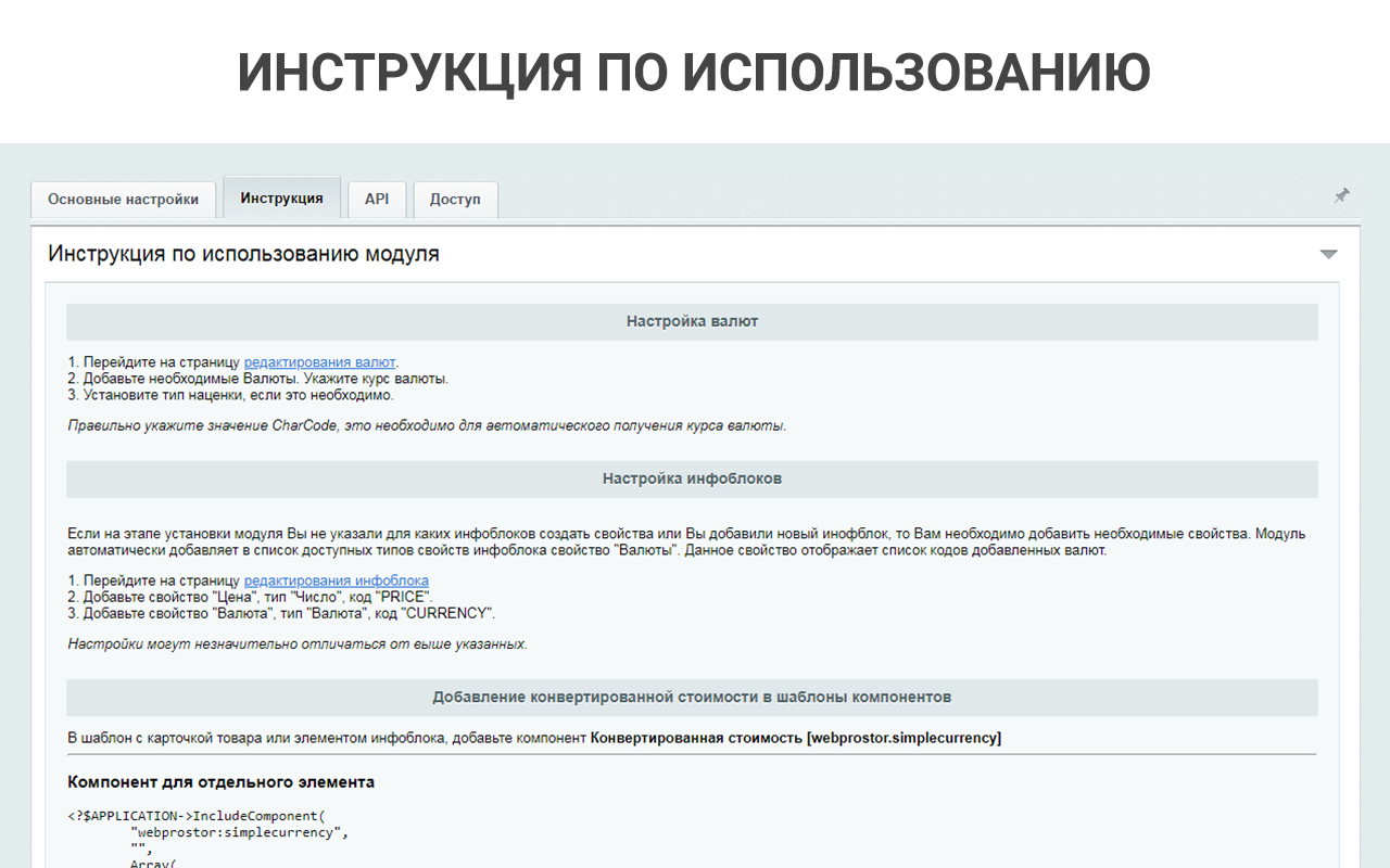 Для фронтальной части сайта может использоваться как простой компонент, так и API модуля. В настройках модуля указана подробная инструкция, как установить компонент в список и карточку элементов. Также можно настроить работу модуля в фоновом режиме, не изменяя компоненты, просто настроив автоматическое обновление цен.