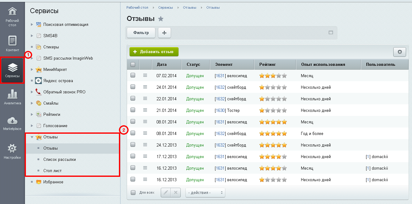 - Подписка пользователей на рассылку информации о размещении новых отзывов о элементе