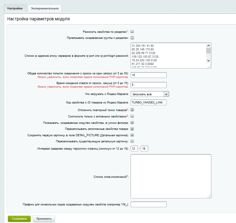- при групповом парсинге между обработкой товаров используется задержка, которая настраивается на странице настроек модуля