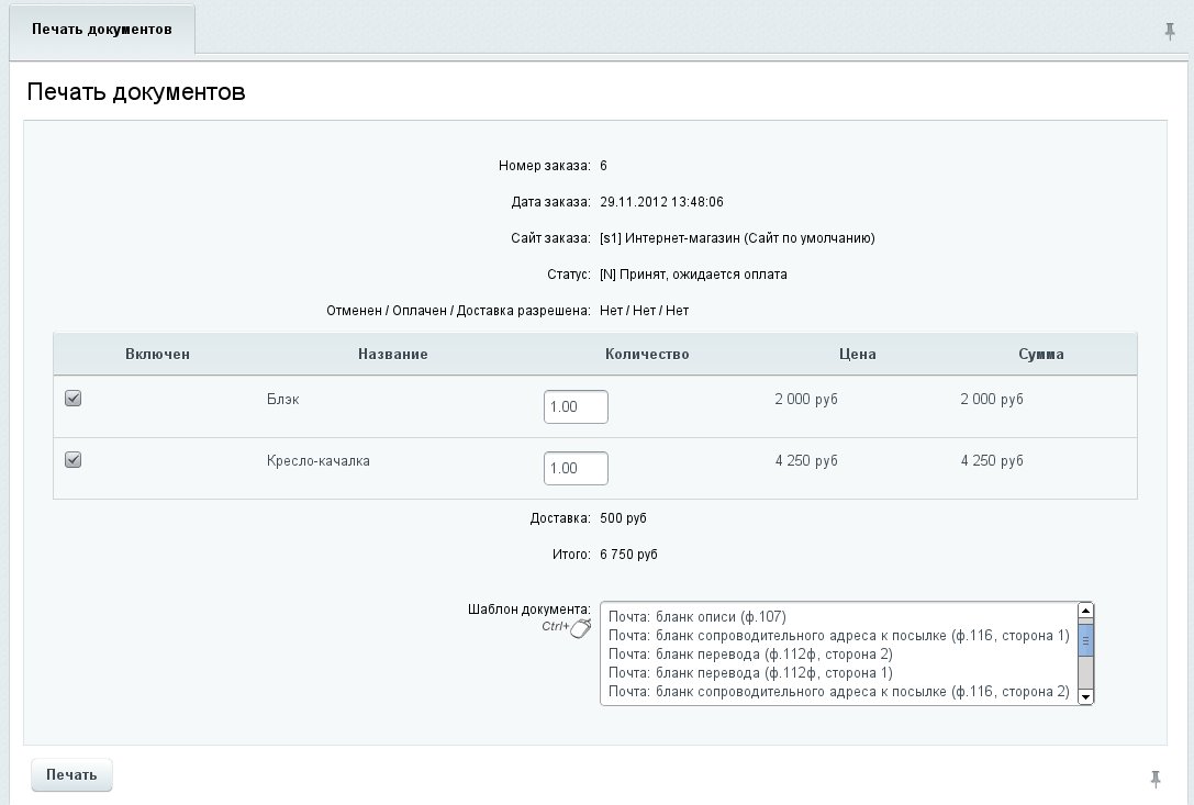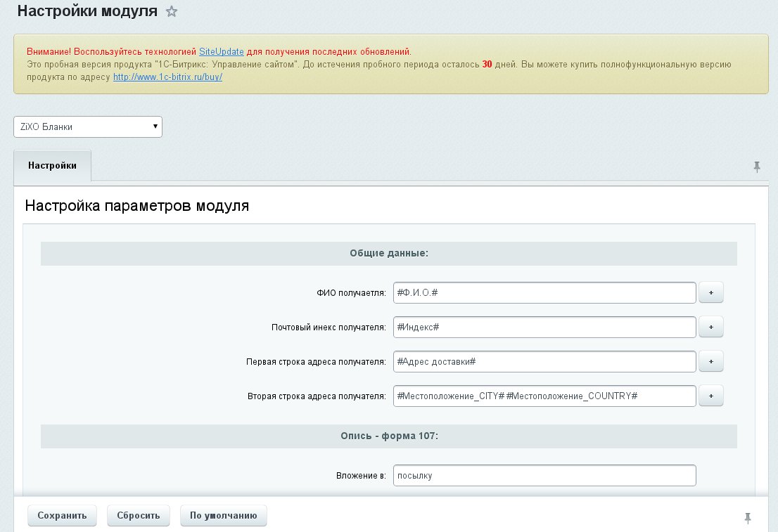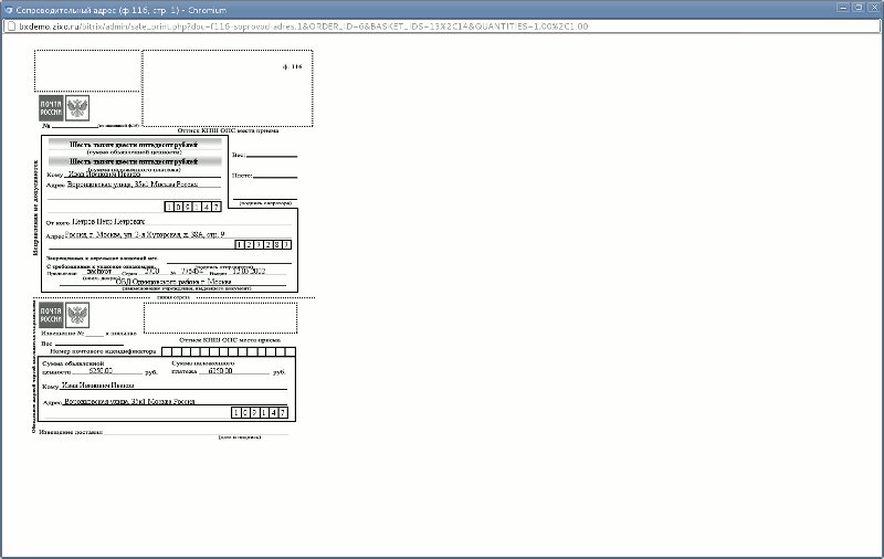 Бланки заполняются данными покупателя из свойств заказа. Данные отправителя заполняются из настроек модуля. В комплект входят бланки: