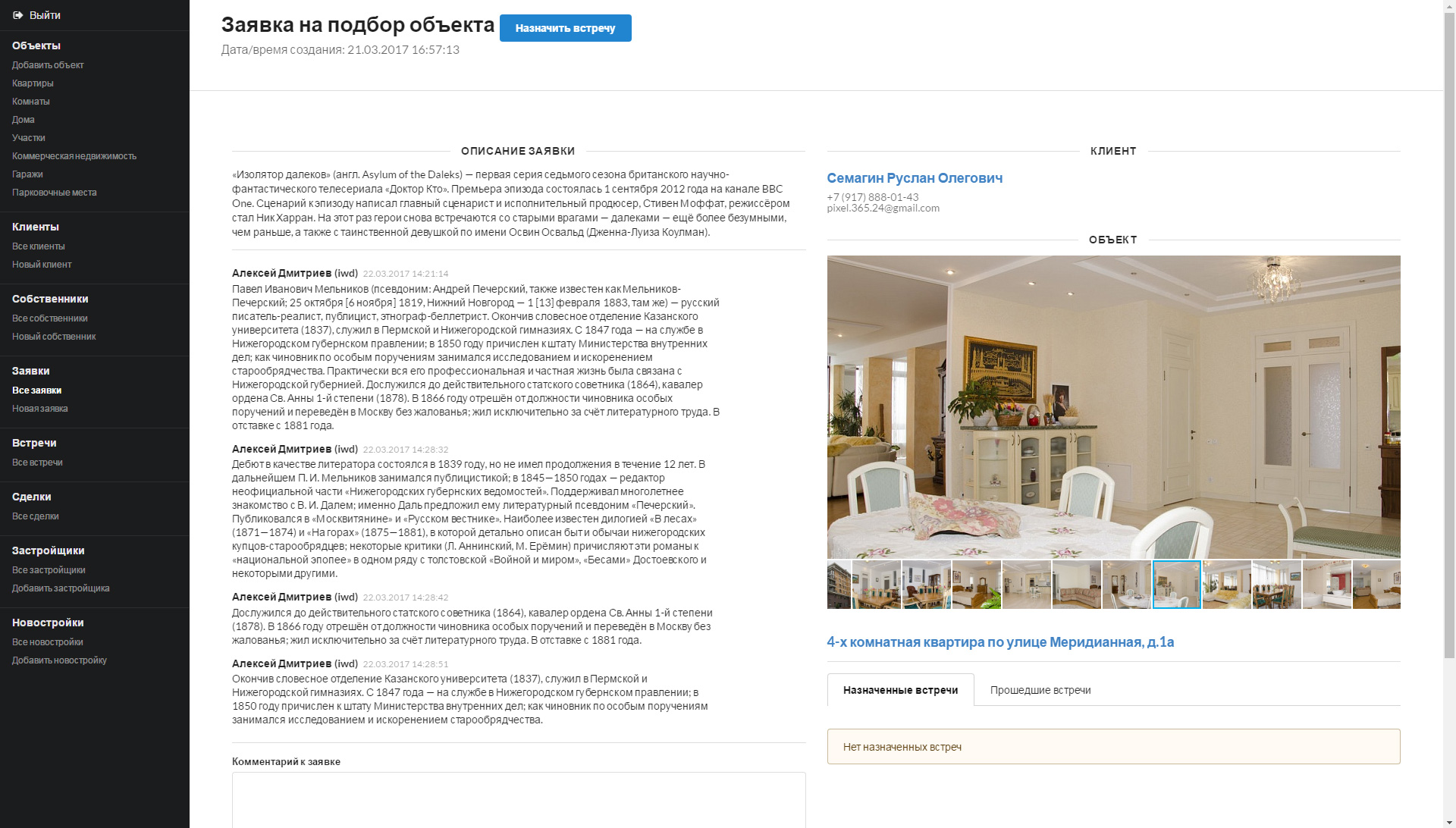 Каждый сотрудник может работать со своими заявками. Заявки можно добавлять в личном кабинете. Также заявки добавляются сотруднику автоматически, если кто либо заинтересовался объектом на сайте, и заполнил форму обратной связи в карточке объекта который ведёт конкретный агент.